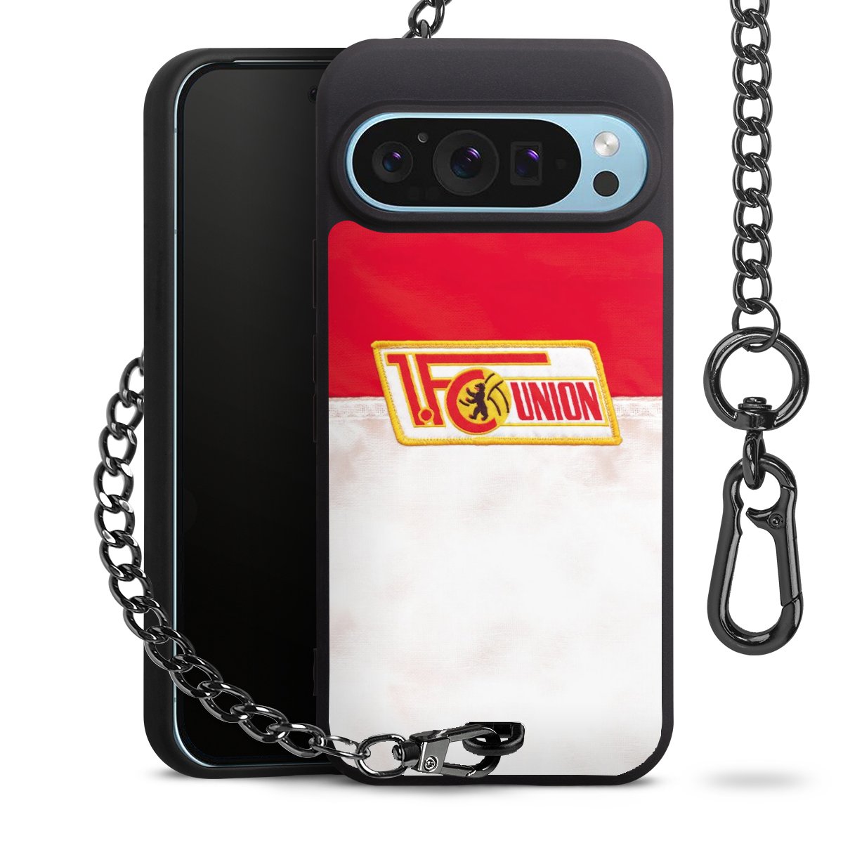 Die mattschwarze Silikon-Handyhülle besteht aus robustem TPU (thermoplastisches Polyurethan). Sie ist flexibel und schützt Dein Smartphone vor Stößen und Kratzern. Die Kette sowie der Karabinerhaken sind aus Metall in Gunmetal-Optik gefertigt. Für dieses Produkt kommen ausschließlich TÜV-geprüfte Materialien zum Einsatz.