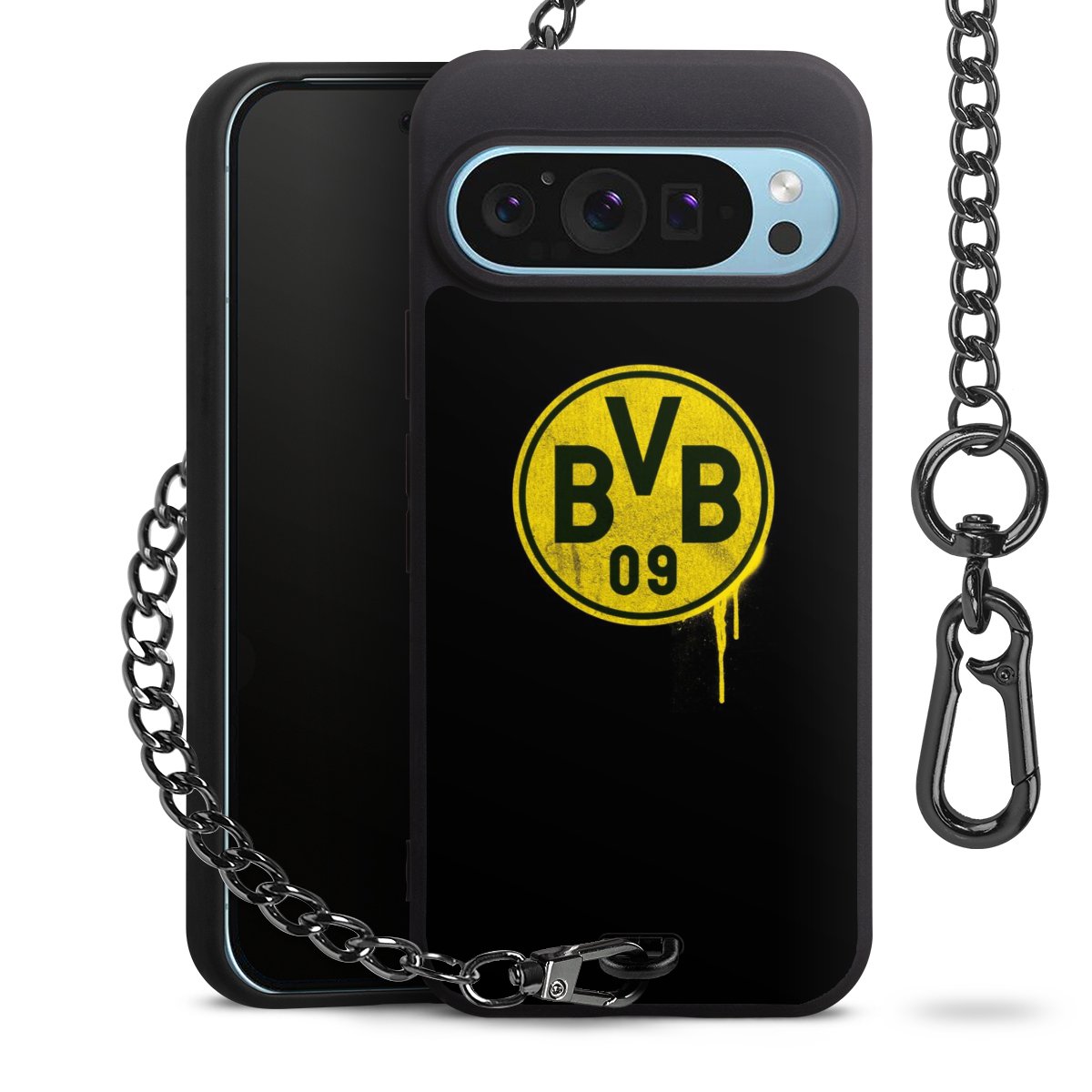 Die mattschwarze Silikon-Handyhülle besteht aus robustem TPU (thermoplastisches Polyurethan). Sie ist flexibel und schützt Dein Smartphone vor Stößen und Kratzern. Die Kette sowie der Karabinerhaken sind aus Metall in Gunmetal-Optik gefertigt. Für dieses Produkt kommen ausschließlich TÜV-geprüfte Materialien zum Einsatz.