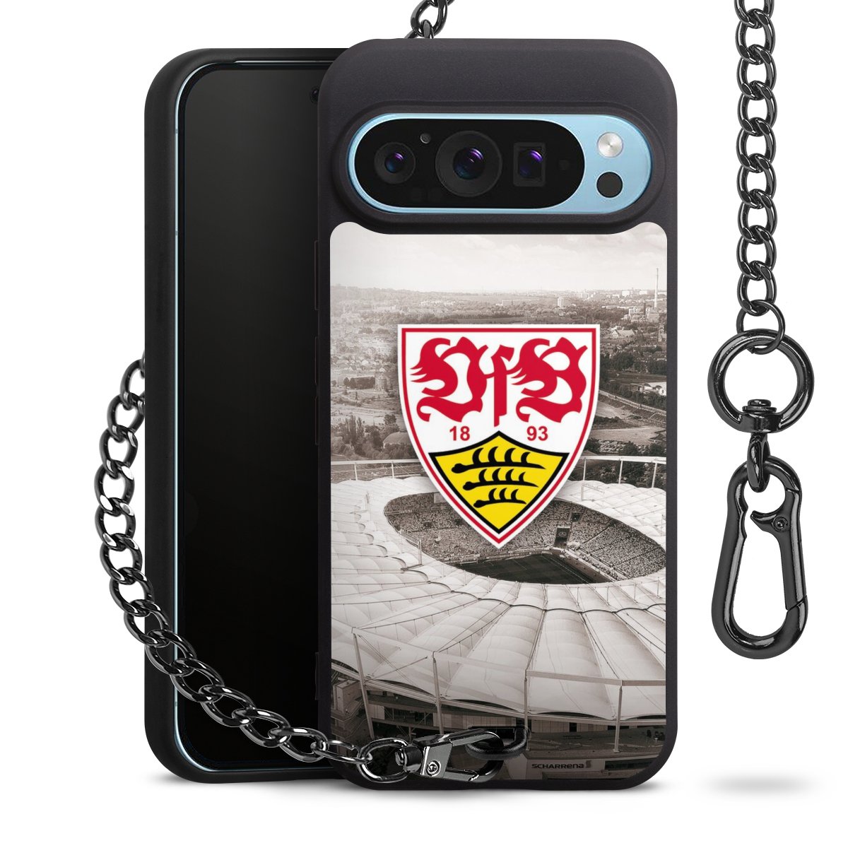 Die mattschwarze Silikon-Handyhülle besteht aus robustem TPU (thermoplastisches Polyurethan). Sie ist flexibel und schützt Dein Smartphone vor Stößen und Kratzern. Die Kette sowie der Karabinerhaken sind aus Metall in Gunmetal-Optik gefertigt. Für dieses Produkt kommen ausschließlich TÜV-geprüfte Materialien zum Einsatz.