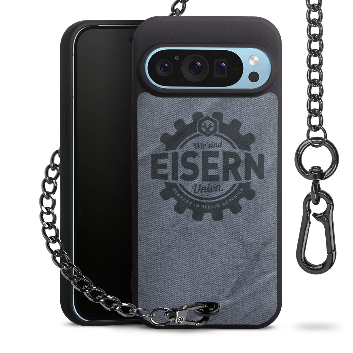 Die mattschwarze Silikon-Handyhülle besteht aus robustem TPU (thermoplastisches Polyurethan). Sie ist flexibel und schützt Dein Smartphone vor Stößen und Kratzern. Die Kette sowie der Karabinerhaken sind aus Metall in Gunmetal-Optik gefertigt. Für dieses Produkt kommen ausschließlich TÜV-geprüfte Materialien zum Einsatz.