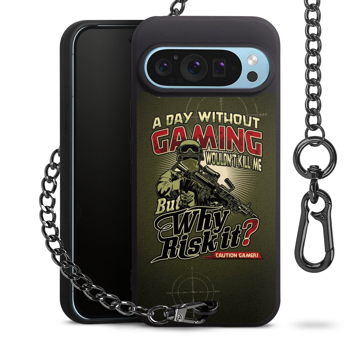 Die mattschwarze Silikon-Handyhülle besteht aus robustem TPU (thermoplastisches Polyurethan). Sie ist flexibel und schützt Dein Smartphone vor Stößen und Kratzern. Die Kette sowie der Karabinerhaken sind aus Metall in Gunmetal-Optik gefertigt. Für dieses Produkt kommen ausschließlich TÜV-geprüfte Materialien zum Einsatz.