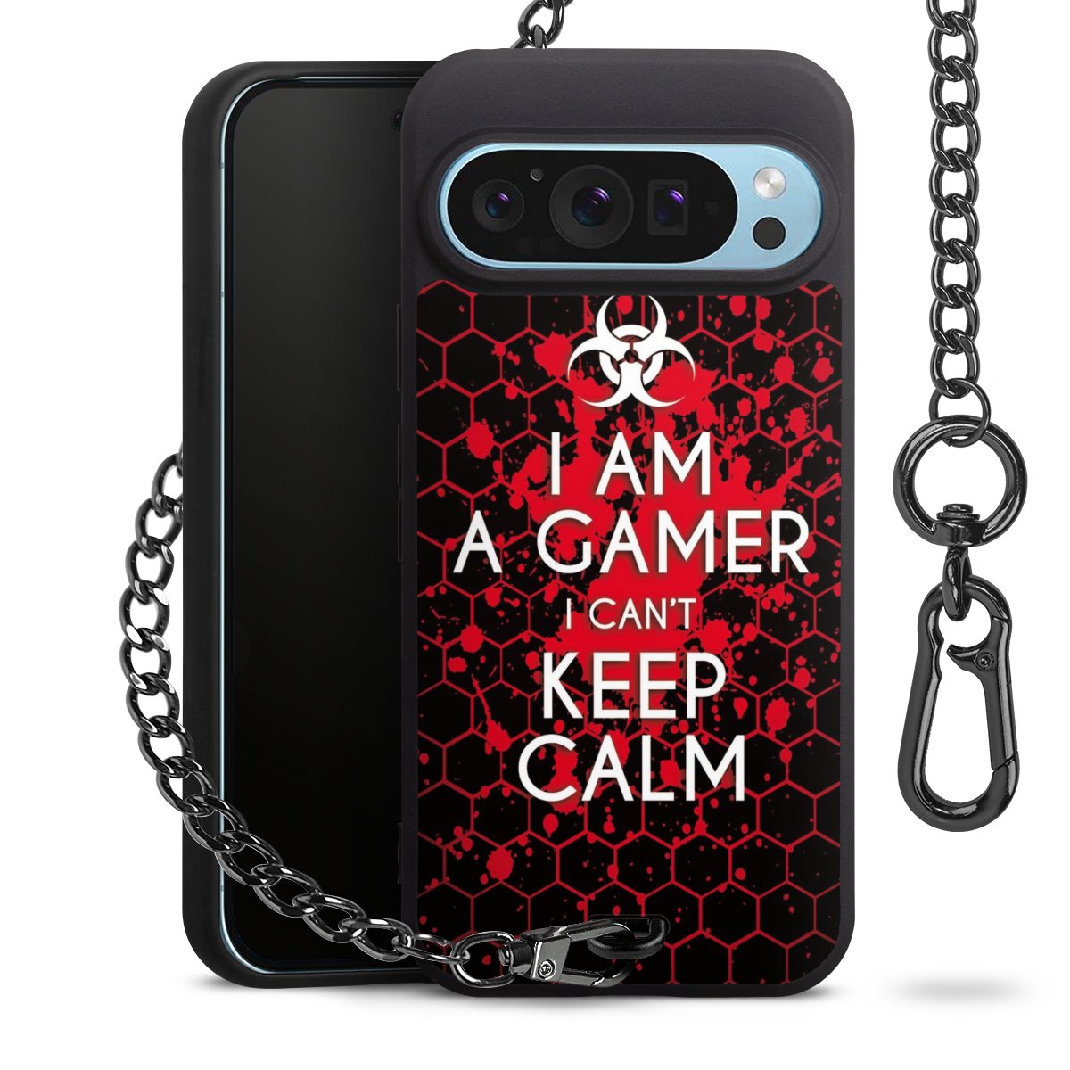 Die mattschwarze Silikon-Handyhülle besteht aus robustem TPU (thermoplastisches Polyurethan). Sie ist flexibel und schützt Dein Smartphone vor Stößen und Kratzern. Die Kette sowie der Karabinerhaken sind aus Metall in Gunmetal-Optik gefertigt. Für dieses Produkt kommen ausschließlich TÜV-geprüfte Materialien zum Einsatz.