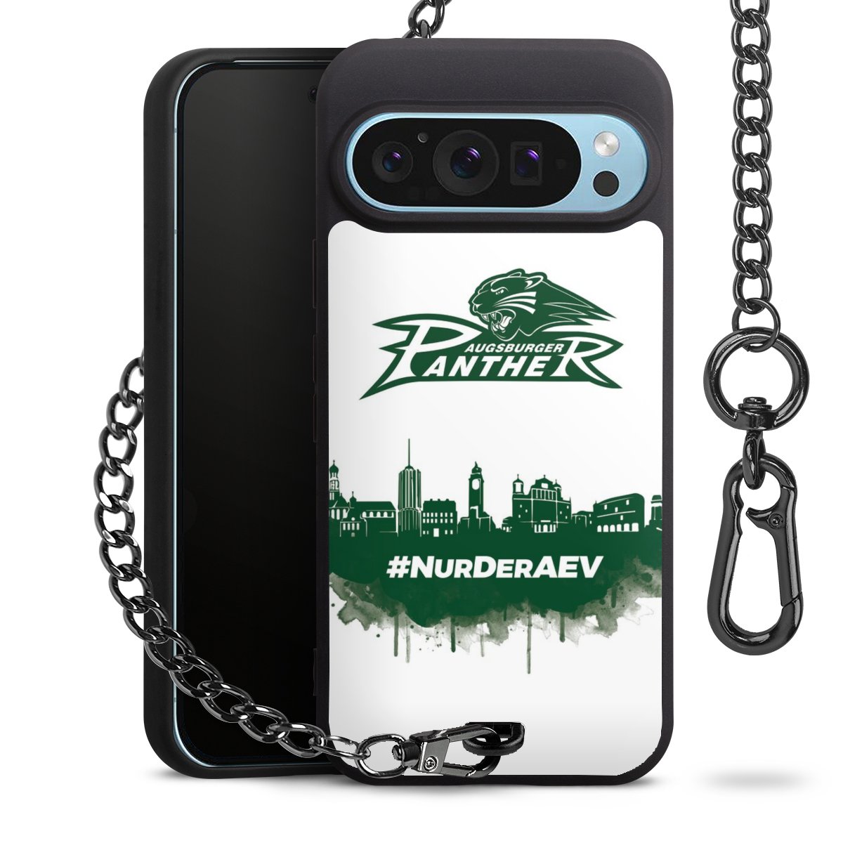 Die mattschwarze Silikon-Handyhülle besteht aus robustem TPU (thermoplastisches Polyurethan). Sie ist flexibel und schützt Dein Smartphone vor Stößen und Kratzern. Die Kette sowie der Karabinerhaken sind aus Metall in Gunmetal-Optik gefertigt. Für dieses Produkt kommen ausschließlich TÜV-geprüfte Materialien zum Einsatz.