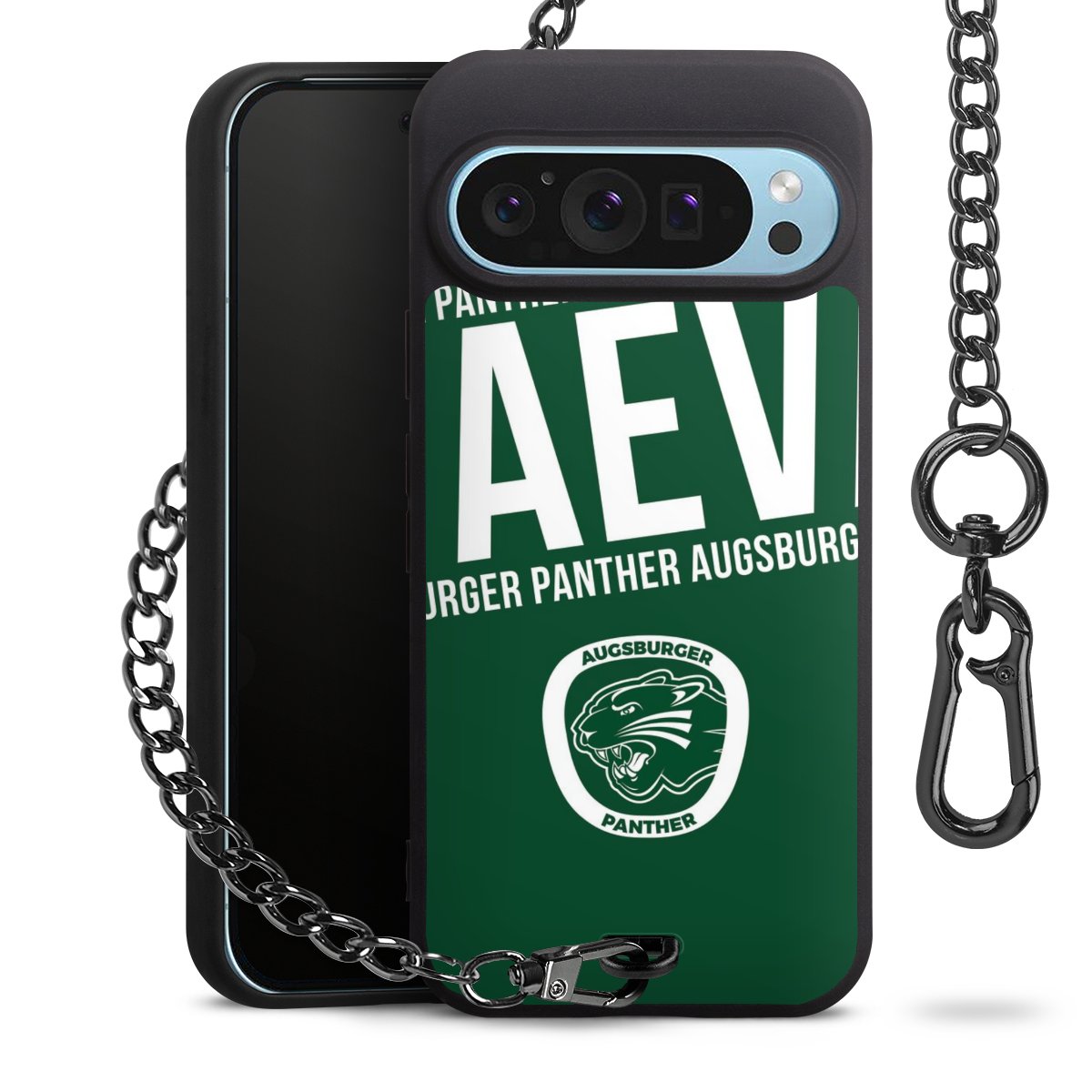 Die mattschwarze Silikon-Handyhülle besteht aus robustem TPU (thermoplastisches Polyurethan). Sie ist flexibel und schützt Dein Smartphone vor Stößen und Kratzern. Die Kette sowie der Karabinerhaken sind aus Metall in Gunmetal-Optik gefertigt. Für dieses Produkt kommen ausschließlich TÜV-geprüfte Materialien zum Einsatz.