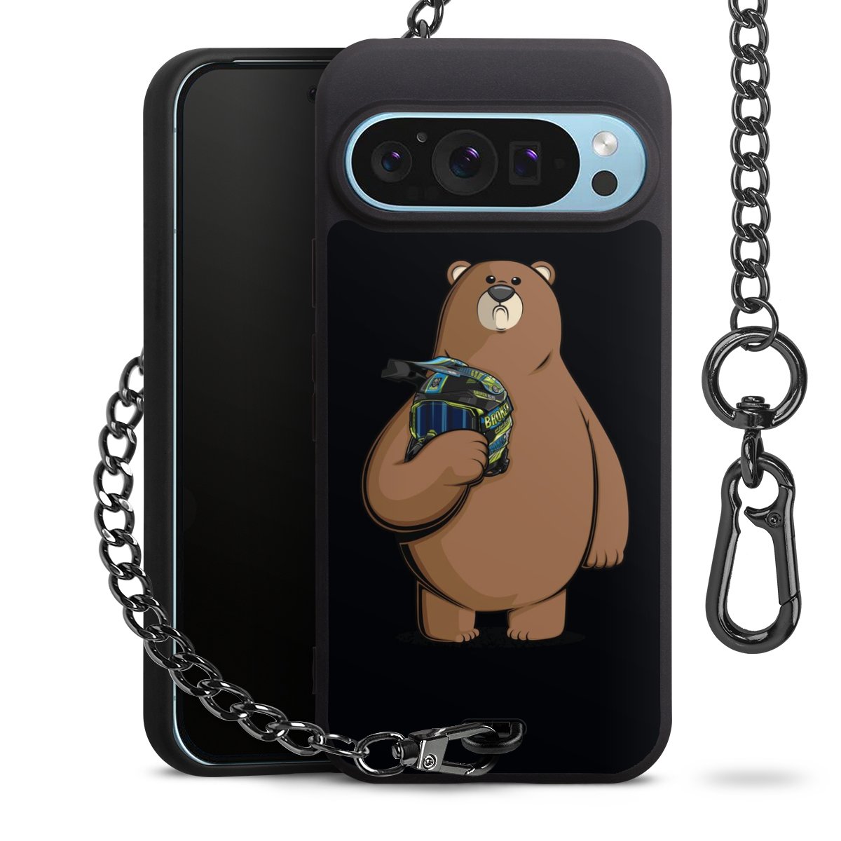 Die mattschwarze Silikon-Handyhülle besteht aus robustem TPU (thermoplastisches Polyurethan). Sie ist flexibel und schützt Dein Smartphone vor Stößen und Kratzern. Die Kette sowie der Karabinerhaken sind aus Metall in Gunmetal-Optik gefertigt. Für dieses Produkt kommen ausschließlich TÜV-geprüfte Materialien zum Einsatz.