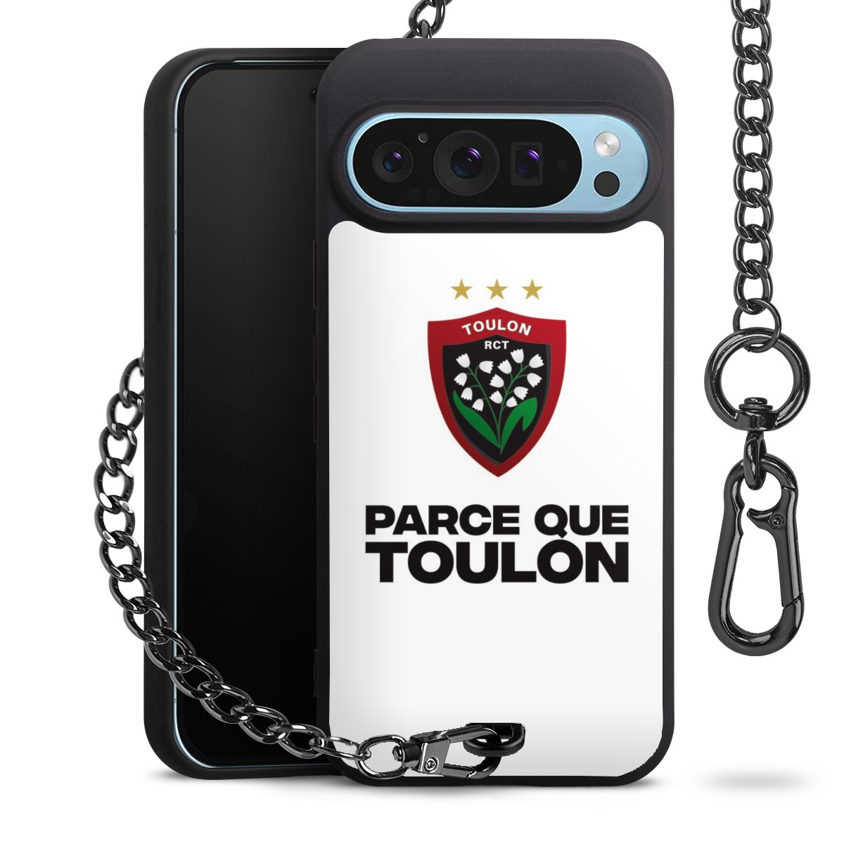Die mattschwarze Silikon-Handyhülle besteht aus robustem TPU (thermoplastisches Polyurethan). Sie ist flexibel und schützt Dein Smartphone vor Stößen und Kratzern. Die Kette sowie der Karabinerhaken sind aus Metall in Gunmetal-Optik gefertigt. Für dieses Produkt kommen ausschließlich TÜV-geprüfte Materialien zum Einsatz.