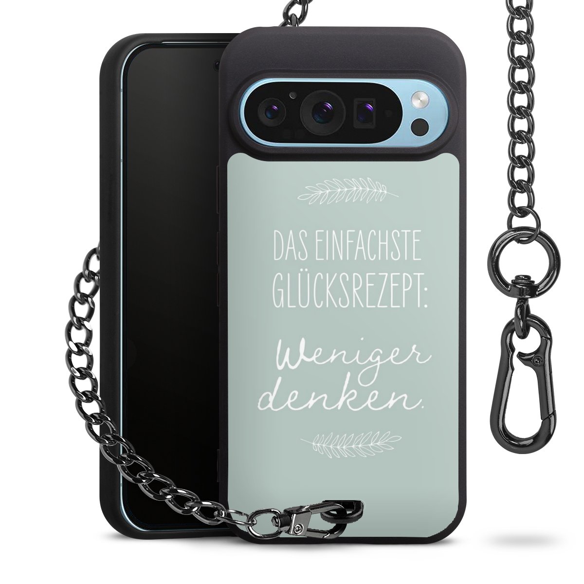 Die mattschwarze Silikon-Handyhülle besteht aus robustem TPU (thermoplastisches Polyurethan). Sie ist flexibel und schützt Dein Smartphone vor Stößen und Kratzern. Die Kette sowie der Karabinerhaken sind aus Metall in Gunmetal-Optik gefertigt. Für dieses Produkt kommen ausschließlich TÜV-geprüfte Materialien zum Einsatz.