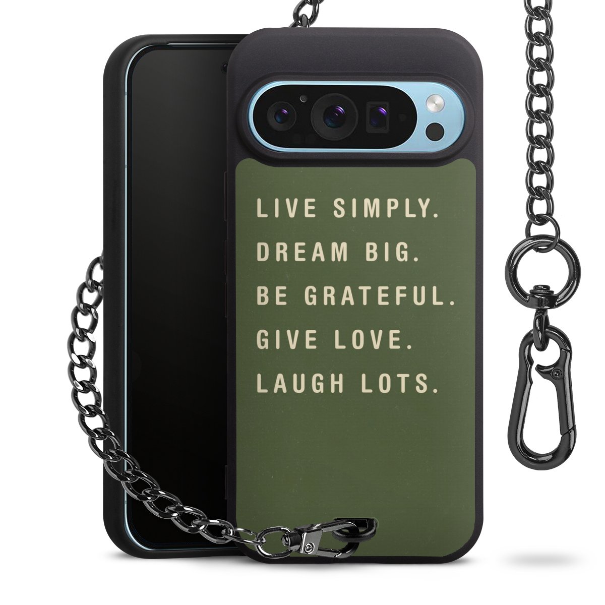Die mattschwarze Silikon-Handyhülle besteht aus robustem TPU (thermoplastisches Polyurethan). Sie ist flexibel und schützt Dein Smartphone vor Stößen und Kratzern. Die Kette sowie der Karabinerhaken sind aus Metall in Gunmetal-Optik gefertigt. Für dieses Produkt kommen ausschließlich TÜV-geprüfte Materialien zum Einsatz.