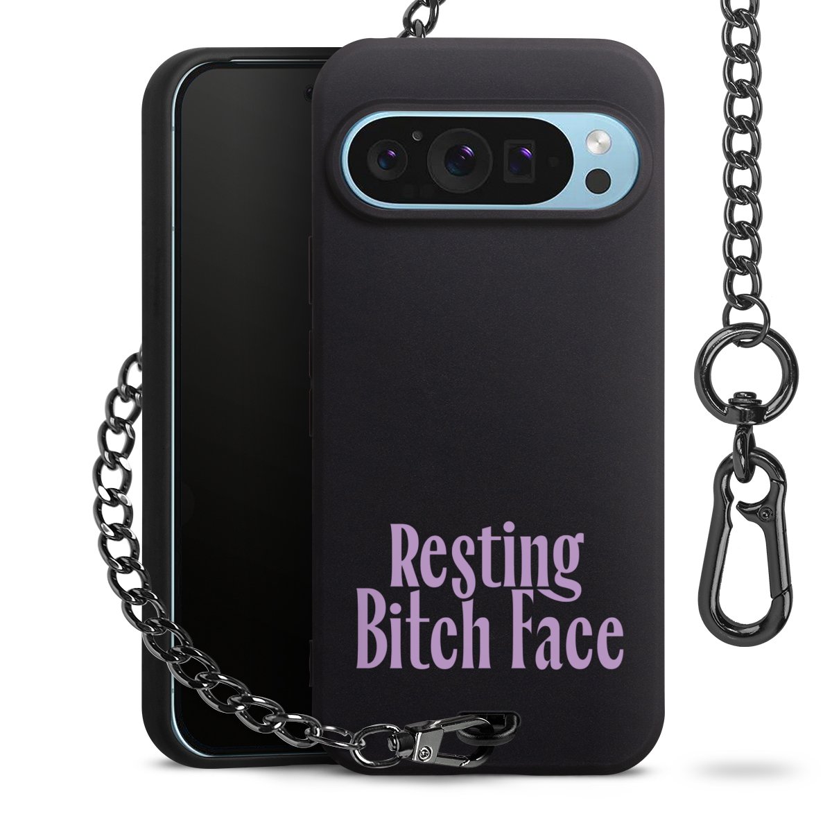 Die mattschwarze Silikon-Handyhülle besteht aus robustem TPU (thermoplastisches Polyurethan). Sie ist flexibel und schützt Dein Smartphone vor Stößen und Kratzern. Die Kette sowie der Karabinerhaken sind aus Metall in Gunmetal-Optik gefertigt. Für dieses Produkt kommen ausschließlich TÜV-geprüfte Materialien zum Einsatz.