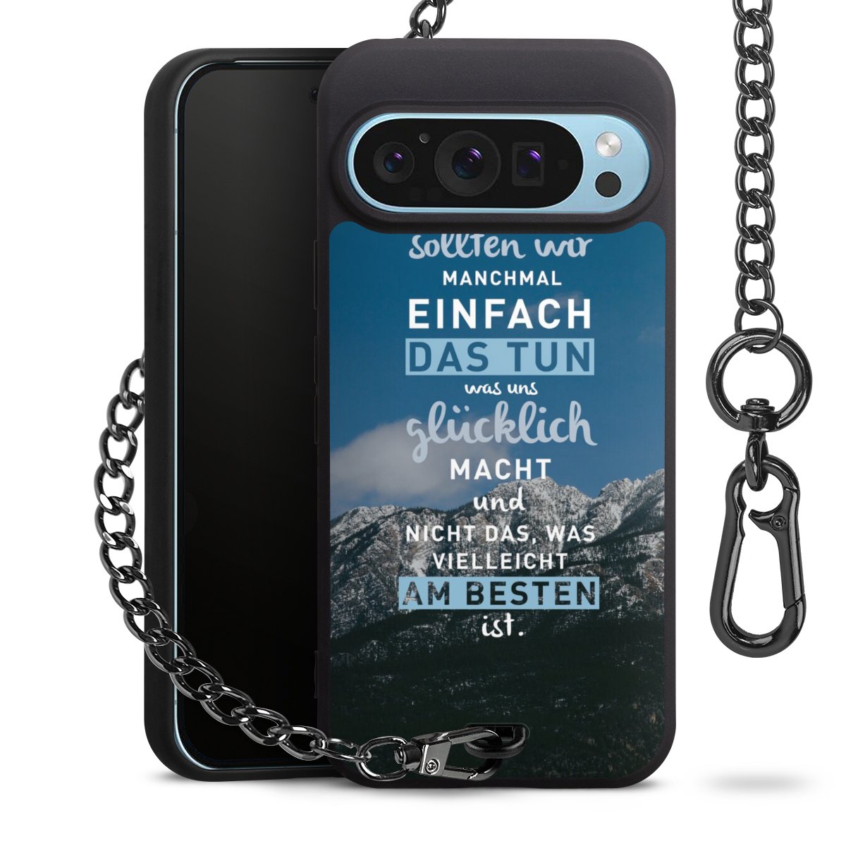 Die mattschwarze Silikon-Handyhülle besteht aus robustem TPU (thermoplastisches Polyurethan). Sie ist flexibel und schützt Dein Smartphone vor Stößen und Kratzern. Die Kette sowie der Karabinerhaken sind aus Metall in Gunmetal-Optik gefertigt. Für dieses Produkt kommen ausschließlich TÜV-geprüfte Materialien zum Einsatz.