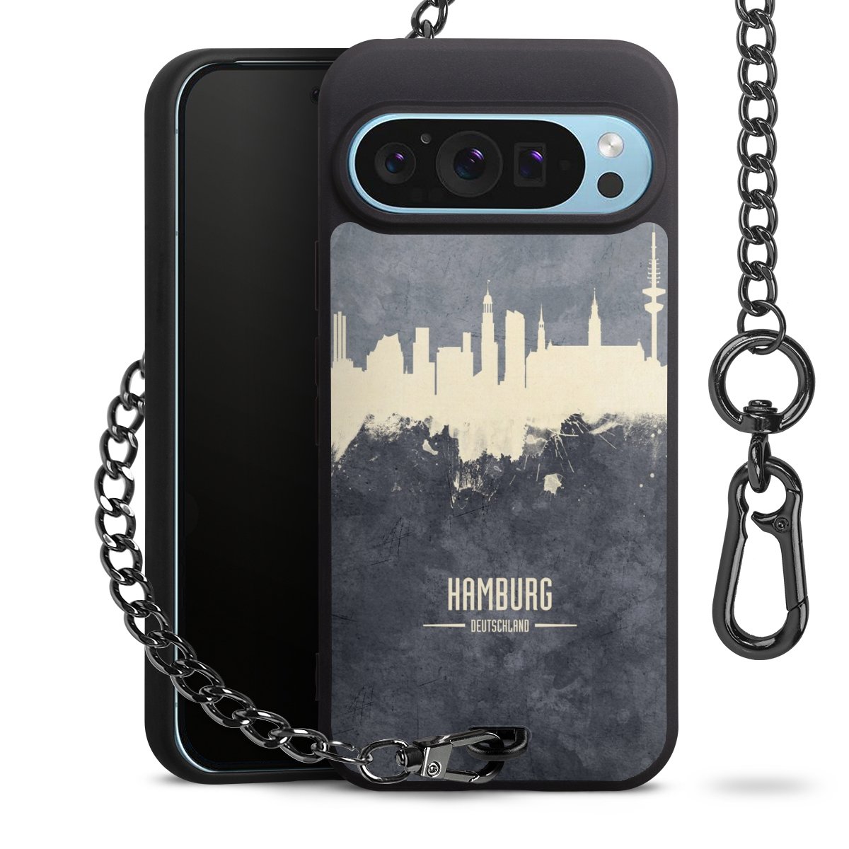Die mattschwarze Silikon-Handyhülle besteht aus robustem TPU (thermoplastisches Polyurethan). Sie ist flexibel und schützt Dein Smartphone vor Stößen und Kratzern. Die Kette sowie der Karabinerhaken sind aus Metall in Gunmetal-Optik gefertigt. Für dieses Produkt kommen ausschließlich TÜV-geprüfte Materialien zum Einsatz.