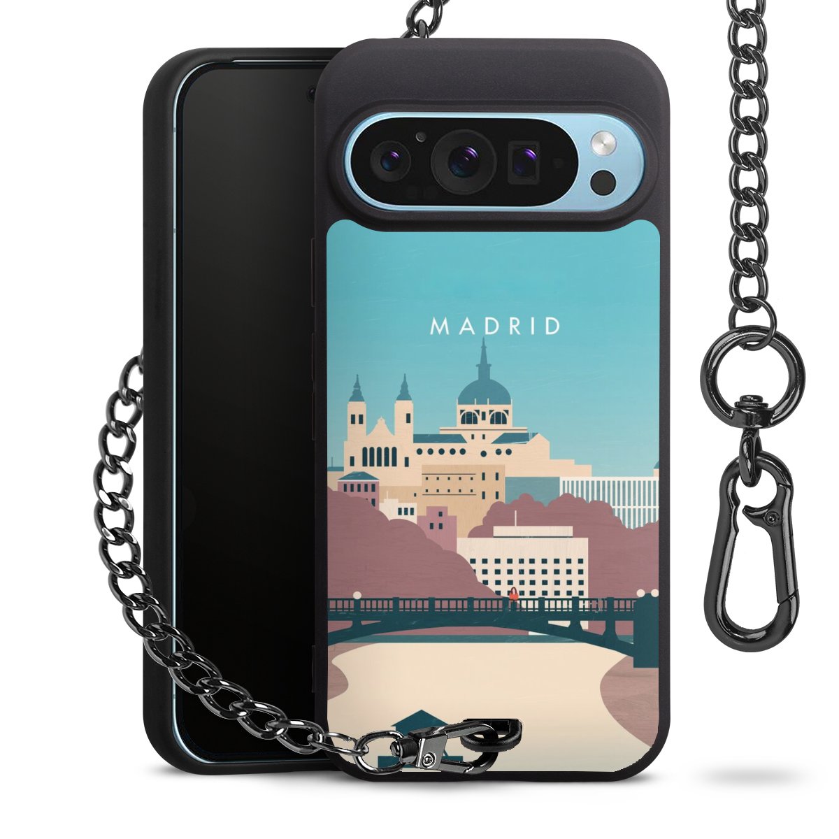 Die mattschwarze Silikon-Handyhülle besteht aus robustem TPU (thermoplastisches Polyurethan). Sie ist flexibel und schützt Dein Smartphone vor Stößen und Kratzern. Die Kette sowie der Karabinerhaken sind aus Metall in Gunmetal-Optik gefertigt. Für dieses Produkt kommen ausschließlich TÜV-geprüfte Materialien zum Einsatz.