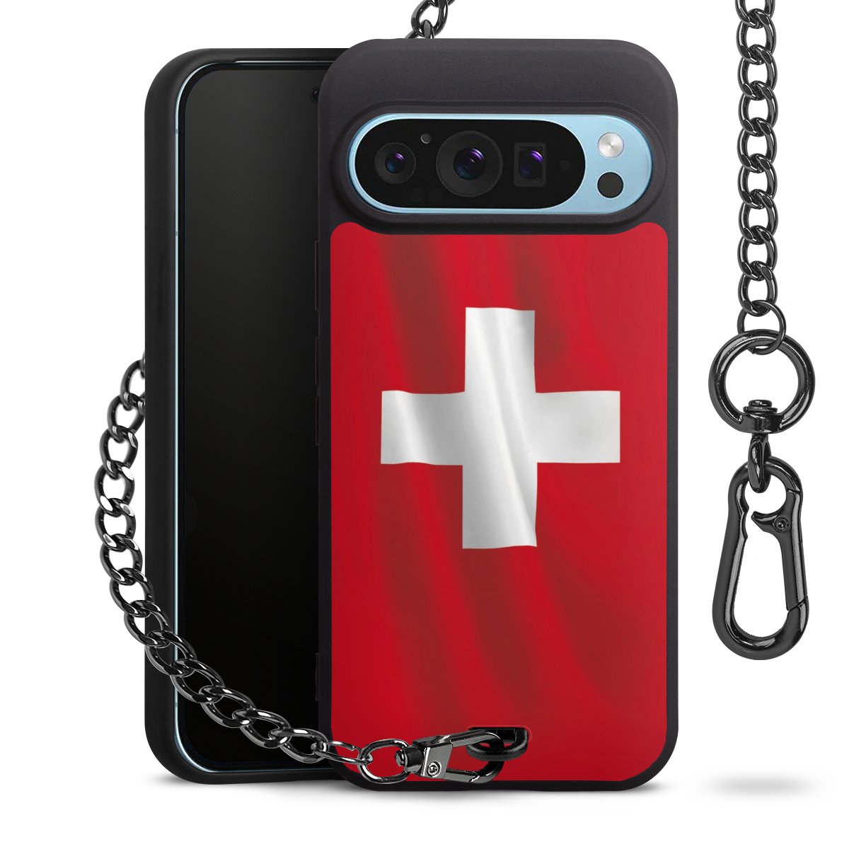 Die mattschwarze Silikon-Handyhülle besteht aus robustem TPU (thermoplastisches Polyurethan). Sie ist flexibel und schützt Dein Smartphone vor Stößen und Kratzern. Die Kette sowie der Karabinerhaken sind aus Metall in Gunmetal-Optik gefertigt. Für dieses Produkt kommen ausschließlich TÜV-geprüfte Materialien zum Einsatz.