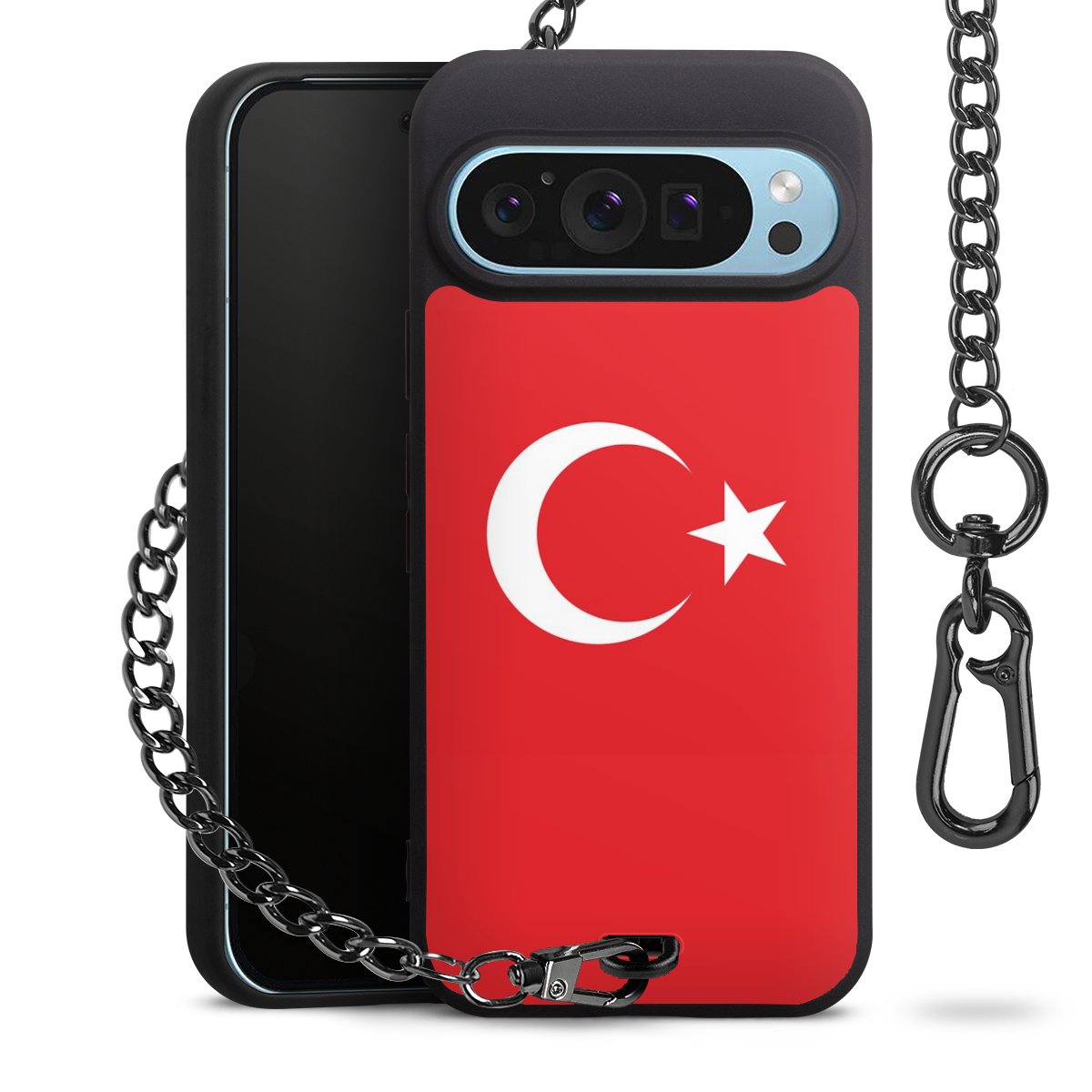 Die mattschwarze Silikon-Handyhülle besteht aus robustem TPU (thermoplastisches Polyurethan). Sie ist flexibel und schützt Dein Smartphone vor Stößen und Kratzern. Die Kette sowie der Karabinerhaken sind aus Metall in Gunmetal-Optik gefertigt. Für dieses Produkt kommen ausschließlich TÜV-geprüfte Materialien zum Einsatz.