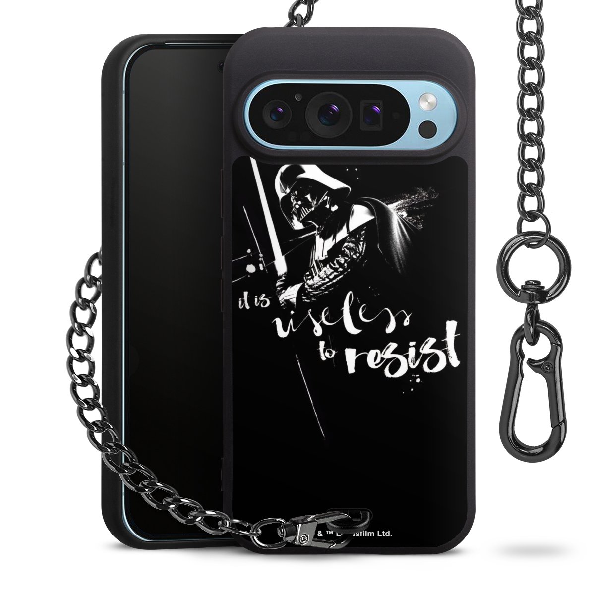 Die mattschwarze Silikon-Handyhülle besteht aus robustem TPU (thermoplastisches Polyurethan). Sie ist flexibel und schützt Dein Smartphone vor Stößen und Kratzern. Die Kette sowie der Karabinerhaken sind aus Metall in Gunmetal-Optik gefertigt. Für dieses Produkt kommen ausschließlich TÜV-geprüfte Materialien zum Einsatz.