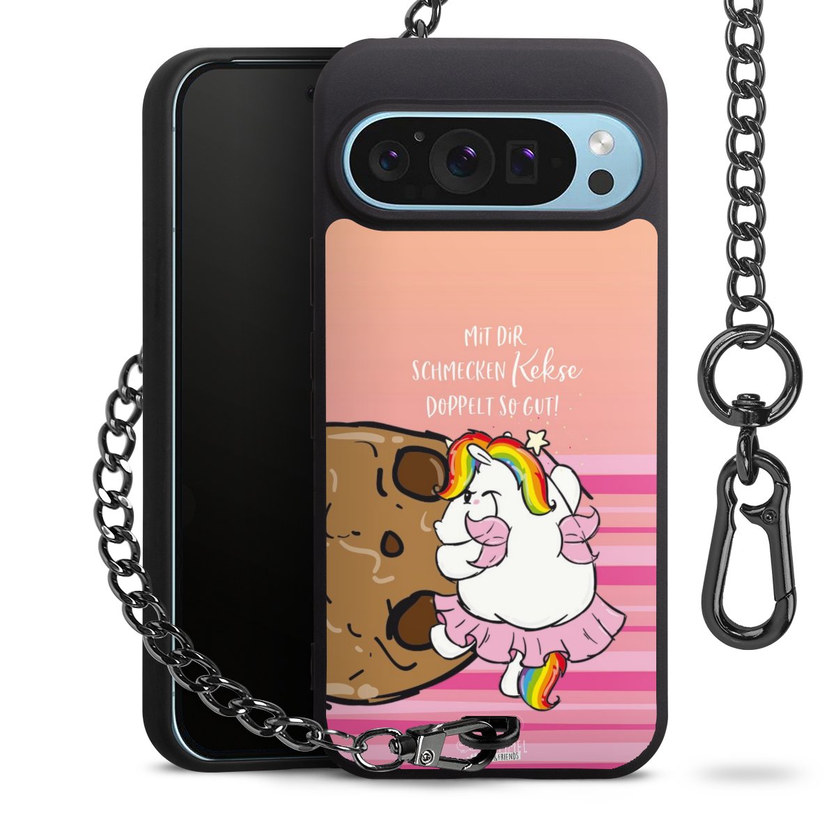 Die mattschwarze Silikon-Handyhülle besteht aus robustem TPU (thermoplastisches Polyurethan). Sie ist flexibel und schützt Dein Smartphone vor Stößen und Kratzern. Die Kette sowie der Karabinerhaken sind aus Metall in Gunmetal-Optik gefertigt. Für dieses Produkt kommen ausschließlich TÜV-geprüfte Materialien zum Einsatz.