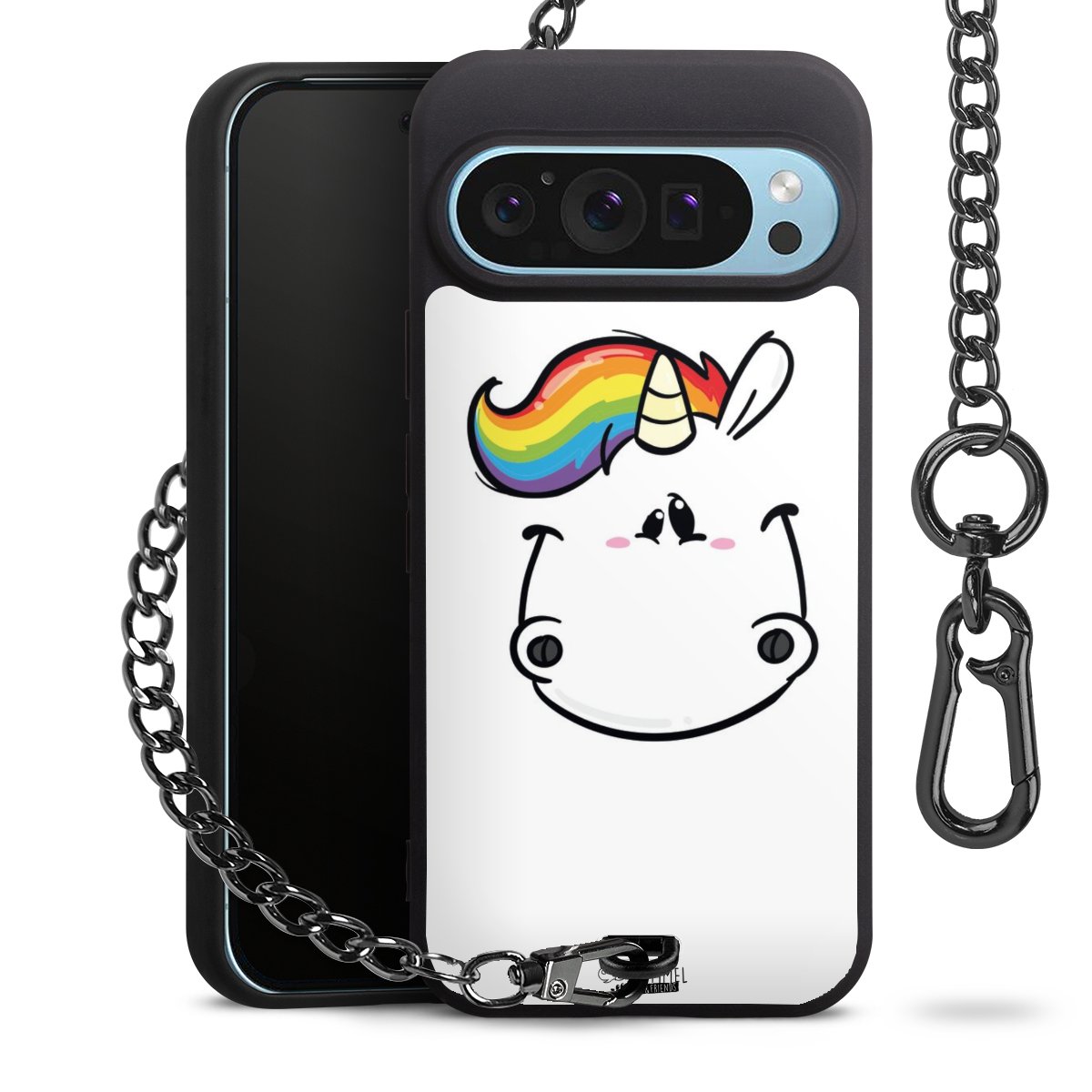 Die mattschwarze Silikon-Handyhülle besteht aus robustem TPU (thermoplastisches Polyurethan). Sie ist flexibel und schützt Dein Smartphone vor Stößen und Kratzern. Die Kette sowie der Karabinerhaken sind aus Metall in Gunmetal-Optik gefertigt. Für dieses Produkt kommen ausschließlich TÜV-geprüfte Materialien zum Einsatz.