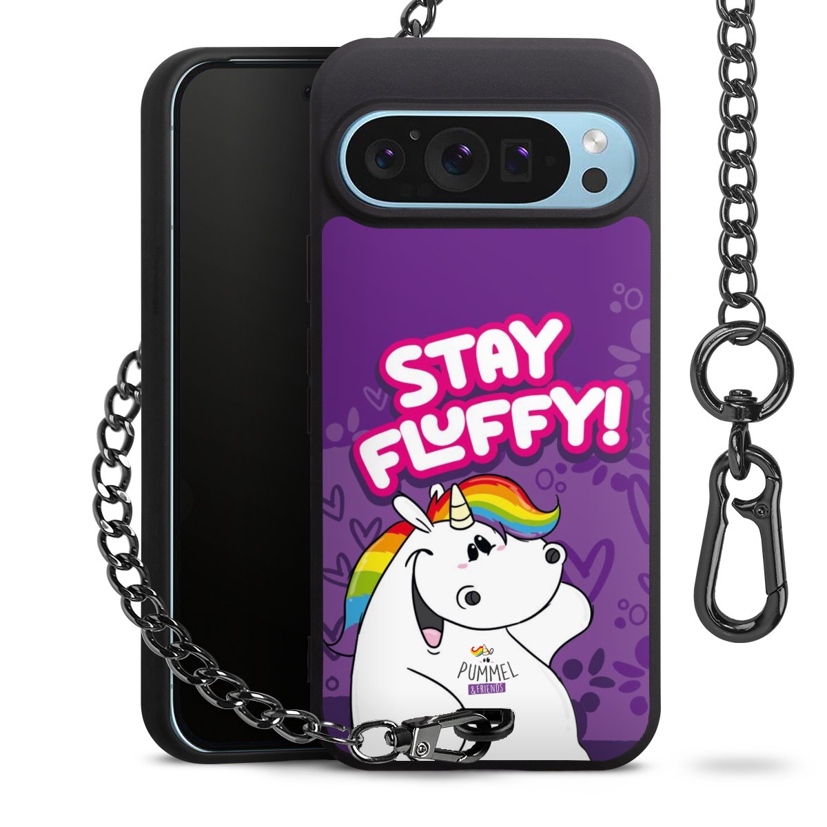 Die mattschwarze Silikon-Handyhülle besteht aus robustem TPU (thermoplastisches Polyurethan). Sie ist flexibel und schützt Dein Smartphone vor Stößen und Kratzern. Die Kette sowie der Karabinerhaken sind aus Metall in Gunmetal-Optik gefertigt. Für dieses Produkt kommen ausschließlich TÜV-geprüfte Materialien zum Einsatz.