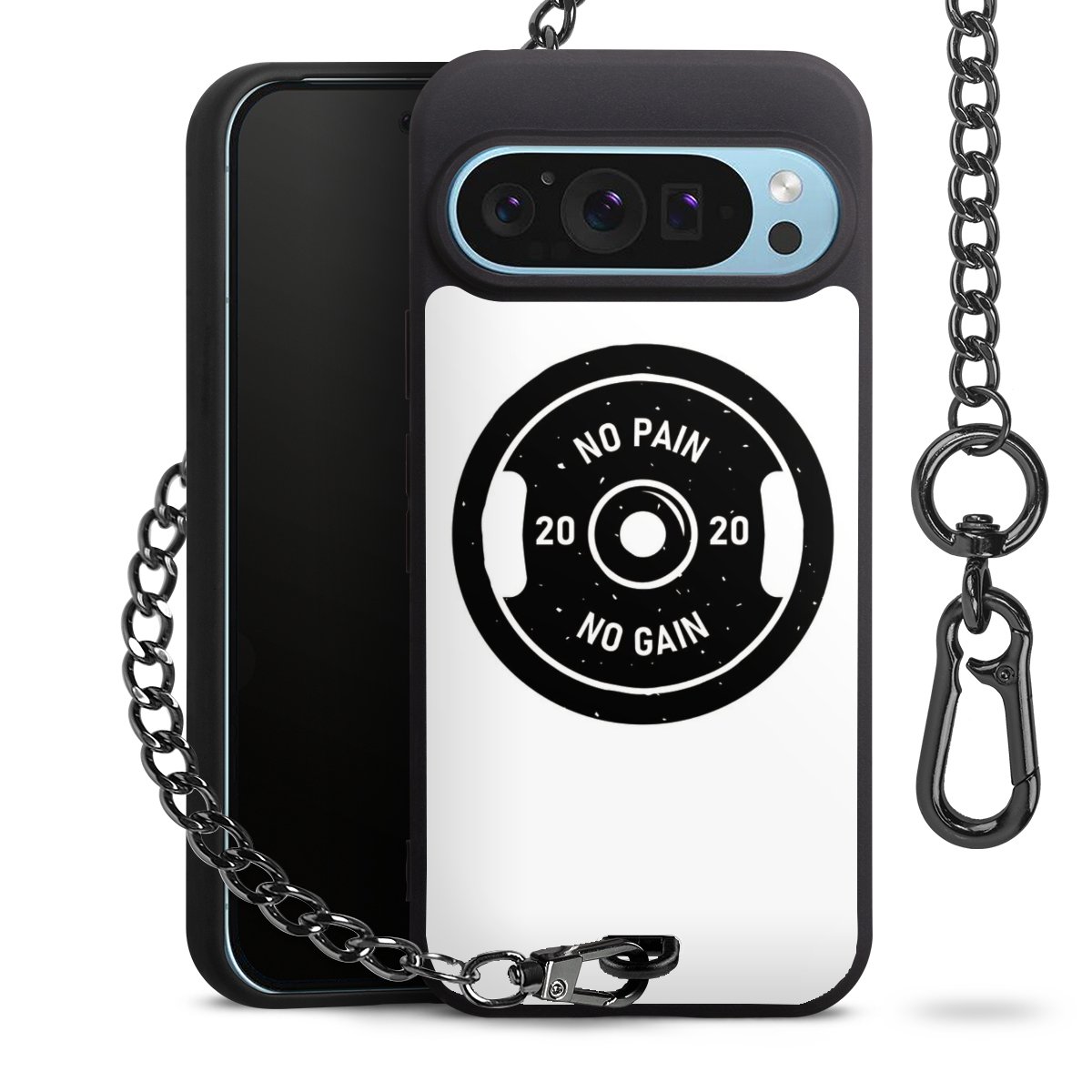 Die mattschwarze Silikon-Handyhülle besteht aus robustem TPU (thermoplastisches Polyurethan). Sie ist flexibel und schützt Dein Smartphone vor Stößen und Kratzern. Die Kette sowie der Karabinerhaken sind aus Metall in Gunmetal-Optik gefertigt. Für dieses Produkt kommen ausschließlich TÜV-geprüfte Materialien zum Einsatz.