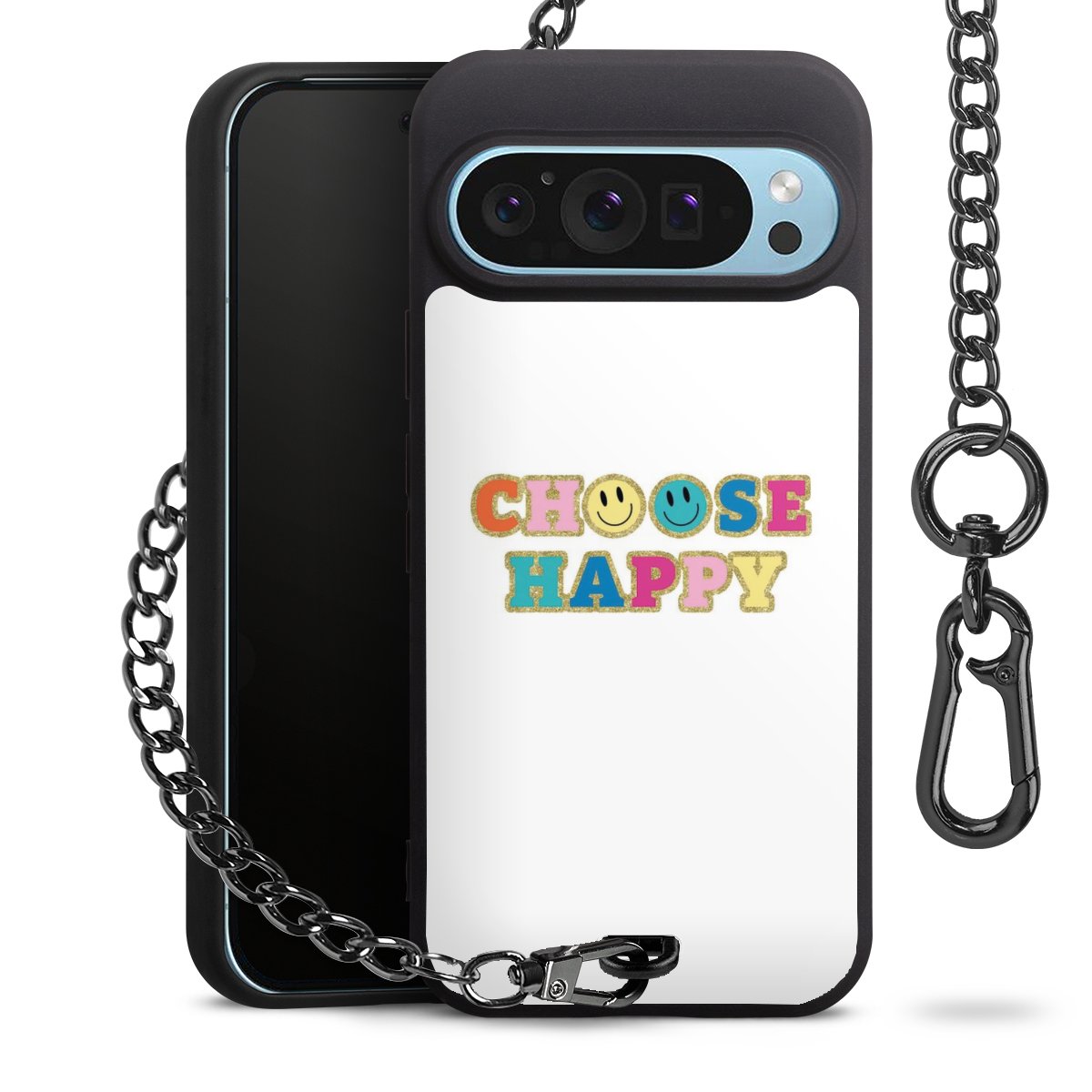 Die mattschwarze Silikon-Handyhülle besteht aus robustem TPU (thermoplastisches Polyurethan). Sie ist flexibel und schützt Dein Smartphone vor Stößen und Kratzern. Die Kette sowie der Karabinerhaken sind aus Metall in Gunmetal-Optik gefertigt. Für dieses Produkt kommen ausschließlich TÜV-geprüfte Materialien zum Einsatz.