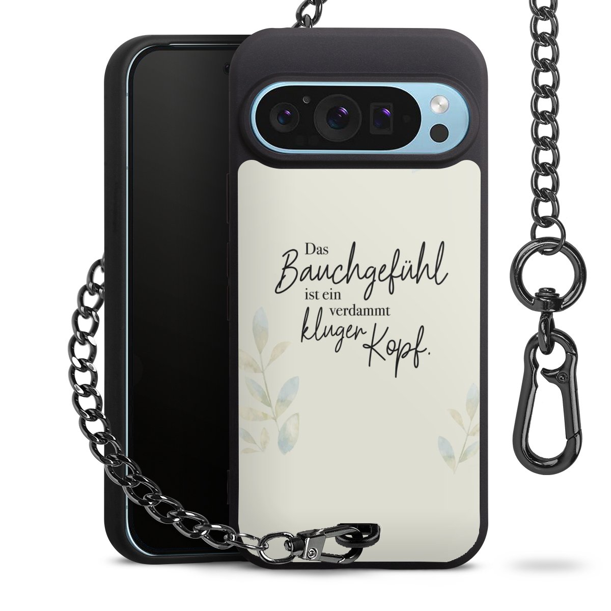 Die mattschwarze Silikon-Handyhülle besteht aus robustem TPU (thermoplastisches Polyurethan). Sie ist flexibel und schützt Dein Smartphone vor Stößen und Kratzern. Die Kette sowie der Karabinerhaken sind aus Metall in Gunmetal-Optik gefertigt. Für dieses Produkt kommen ausschließlich TÜV-geprüfte Materialien zum Einsatz.