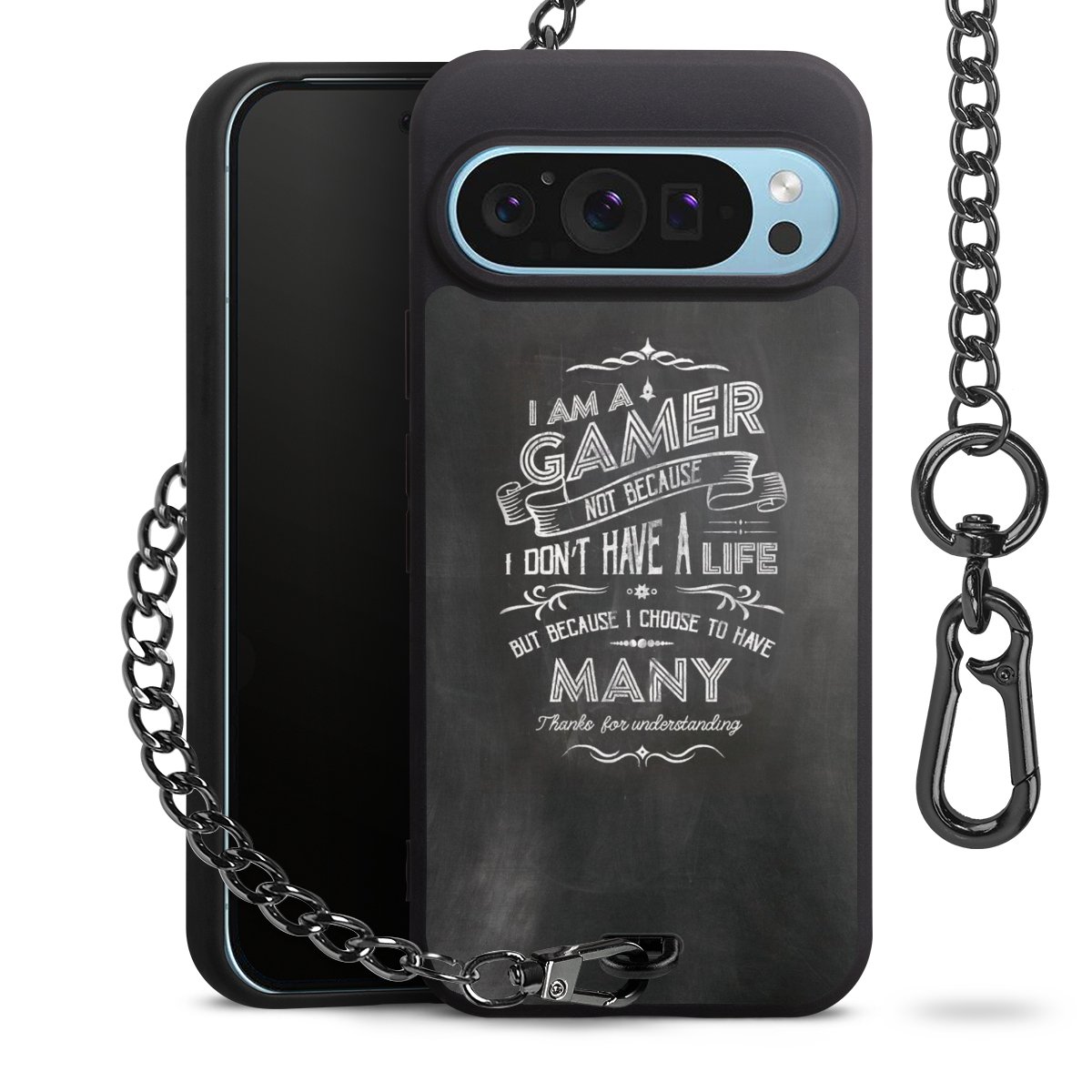 Die mattschwarze Silikon-Handyhülle besteht aus robustem TPU (thermoplastisches Polyurethan). Sie ist flexibel und schützt Dein Smartphone vor Stößen und Kratzern. Die Kette sowie der Karabinerhaken sind aus Metall in Gunmetal-Optik gefertigt. Für dieses Produkt kommen ausschließlich TÜV-geprüfte Materialien zum Einsatz.