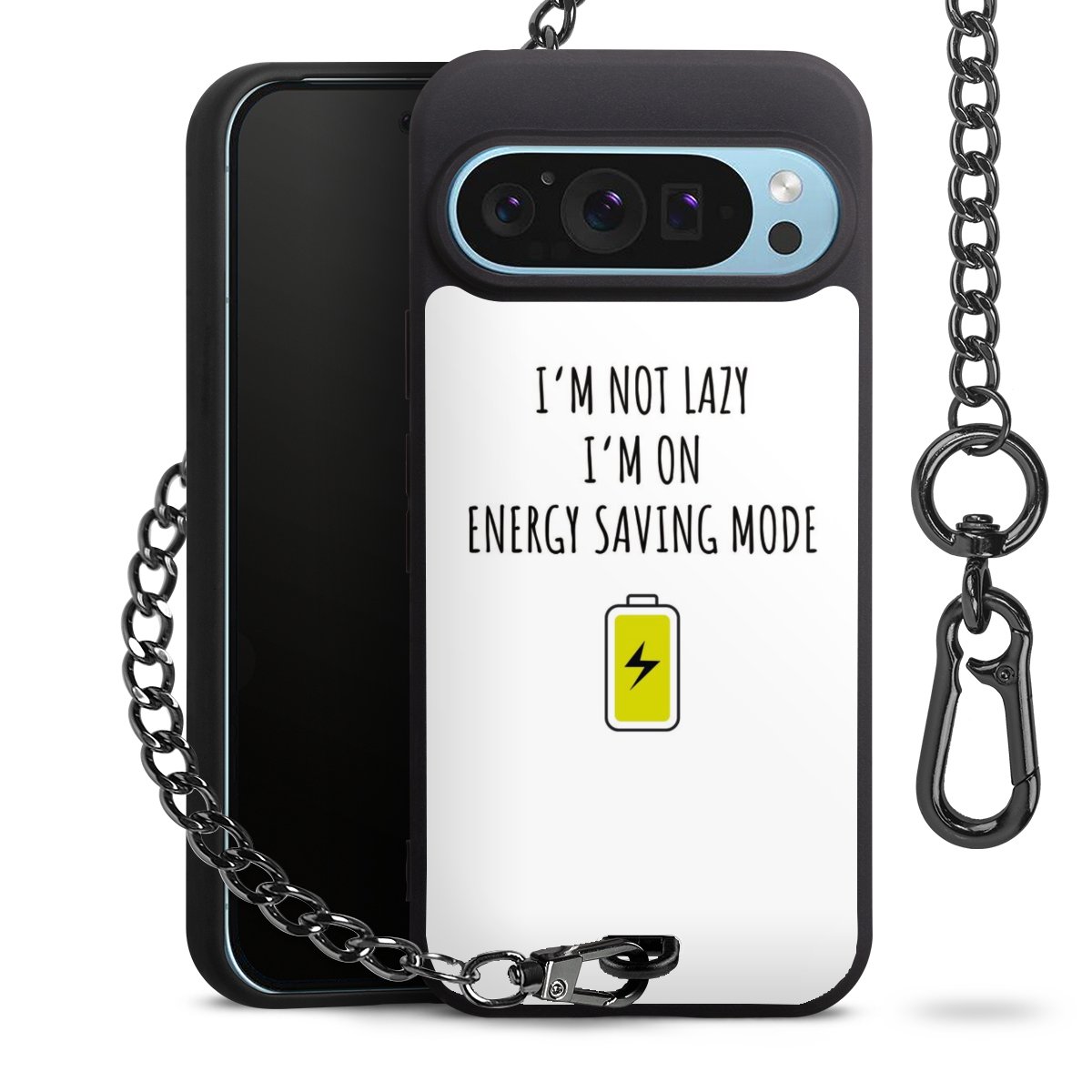 Die mattschwarze Silikon-Handyhülle besteht aus robustem TPU (thermoplastisches Polyurethan). Sie ist flexibel und schützt Dein Smartphone vor Stößen und Kratzern. Die Kette sowie der Karabinerhaken sind aus Metall in Gunmetal-Optik gefertigt. Für dieses Produkt kommen ausschließlich TÜV-geprüfte Materialien zum Einsatz.