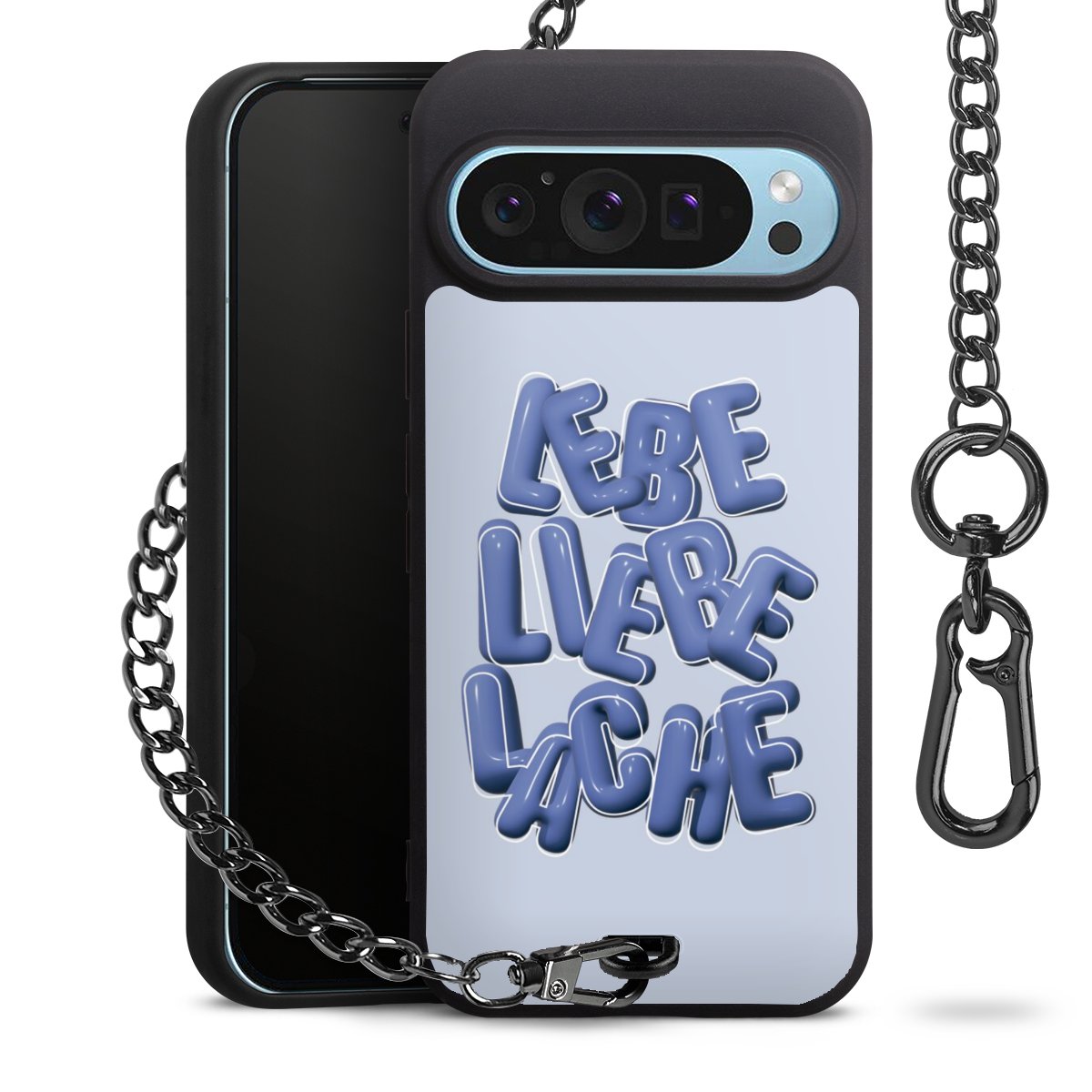 Die mattschwarze Silikon-Handyhülle besteht aus robustem TPU (thermoplastisches Polyurethan). Sie ist flexibel und schützt Dein Smartphone vor Stößen und Kratzern. Die Kette sowie der Karabinerhaken sind aus Metall in Gunmetal-Optik gefertigt. Für dieses Produkt kommen ausschließlich TÜV-geprüfte Materialien zum Einsatz.