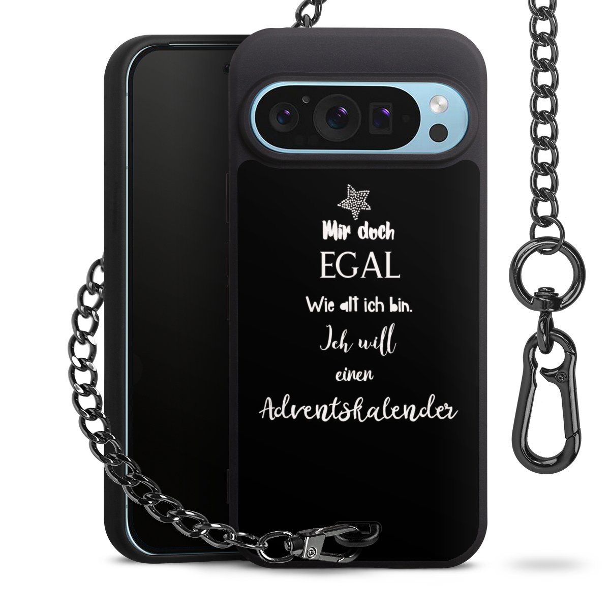 Die mattschwarze Silikon-Handyhülle besteht aus robustem TPU (thermoplastisches Polyurethan). Sie ist flexibel und schützt Dein Smartphone vor Stößen und Kratzern. Die Kette sowie der Karabinerhaken sind aus Metall in Gunmetal-Optik gefertigt. Für dieses Produkt kommen ausschließlich TÜV-geprüfte Materialien zum Einsatz.