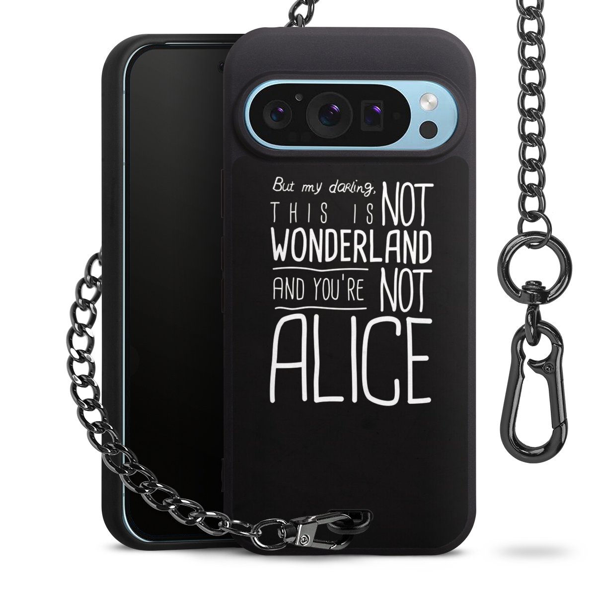 Die mattschwarze Silikon-Handyhülle besteht aus robustem TPU (thermoplastisches Polyurethan). Sie ist flexibel und schützt Dein Smartphone vor Stößen und Kratzern. Die Kette sowie der Karabinerhaken sind aus Metall in Gunmetal-Optik gefertigt. Für dieses Produkt kommen ausschließlich TÜV-geprüfte Materialien zum Einsatz.