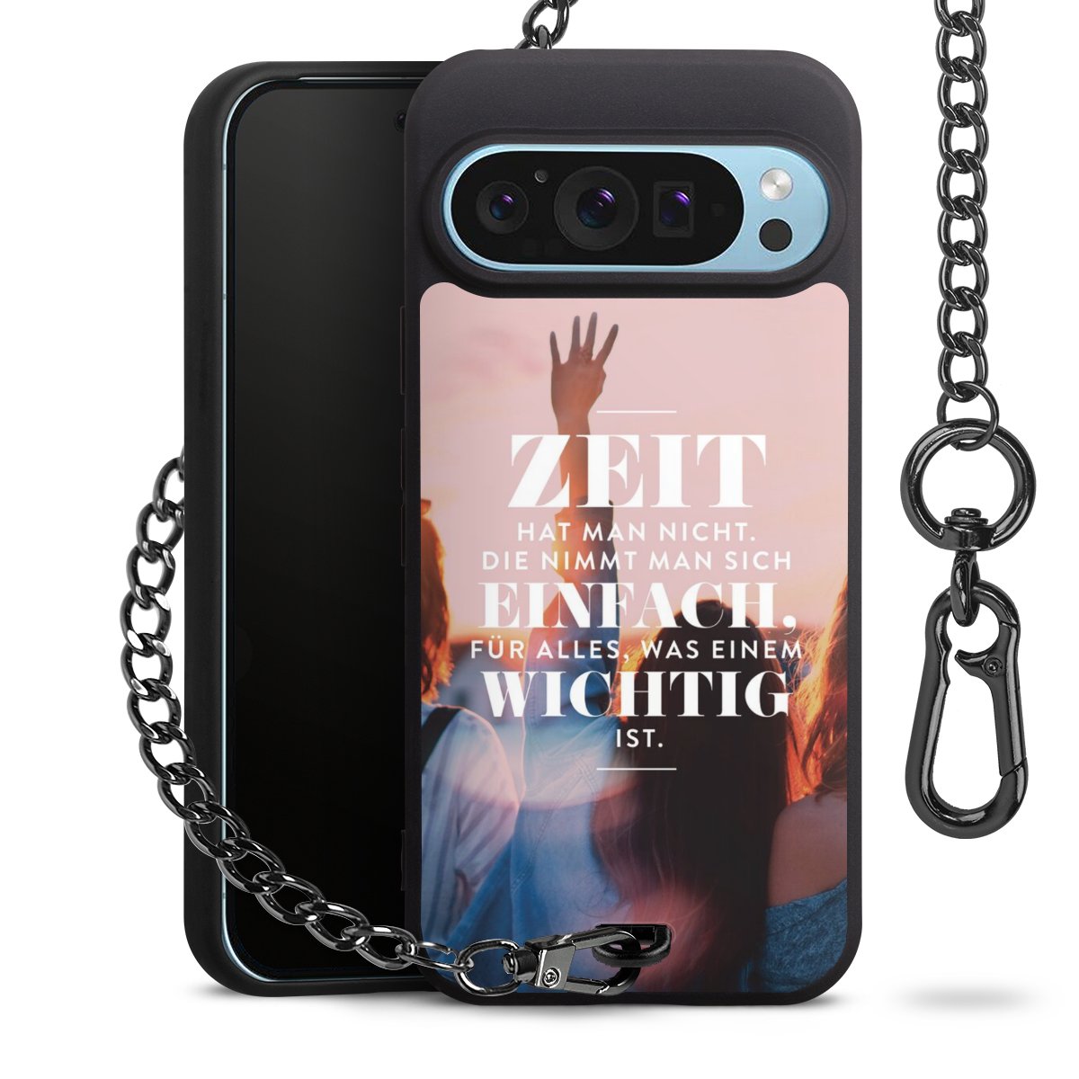 Die mattschwarze Silikon-Handyhülle besteht aus robustem TPU (thermoplastisches Polyurethan). Sie ist flexibel und schützt Dein Smartphone vor Stößen und Kratzern. Die Kette sowie der Karabinerhaken sind aus Metall in Gunmetal-Optik gefertigt. Für dieses Produkt kommen ausschließlich TÜV-geprüfte Materialien zum Einsatz.
