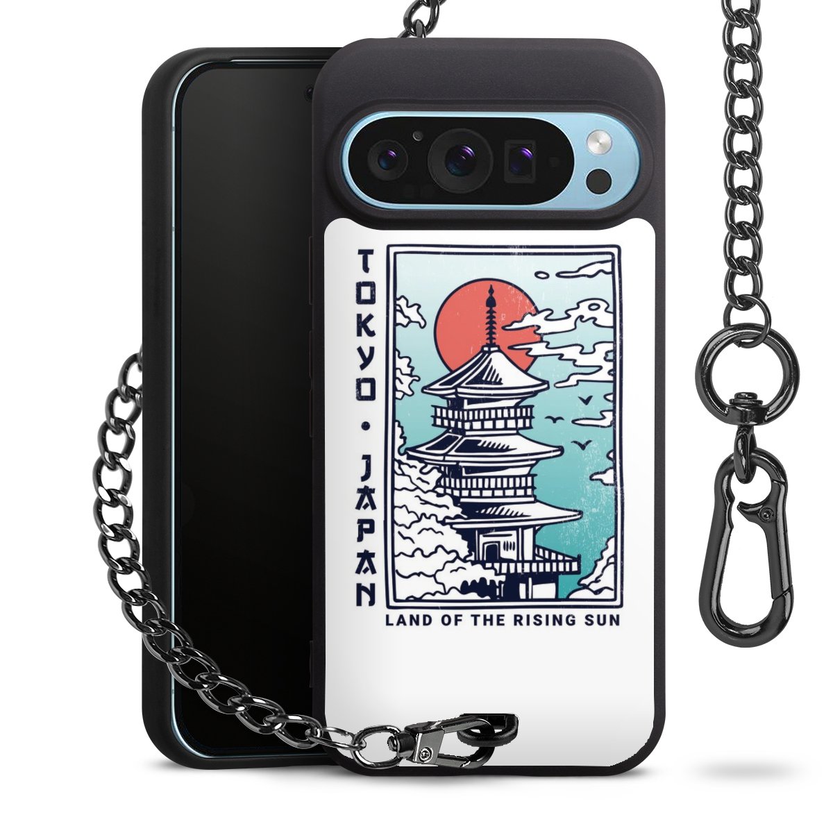 Die mattschwarze Silikon-Handyhülle besteht aus robustem TPU (thermoplastisches Polyurethan). Sie ist flexibel und schützt Dein Smartphone vor Stößen und Kratzern. Die Kette sowie der Karabinerhaken sind aus Metall in Gunmetal-Optik gefertigt. Für dieses Produkt kommen ausschließlich TÜV-geprüfte Materialien zum Einsatz.
