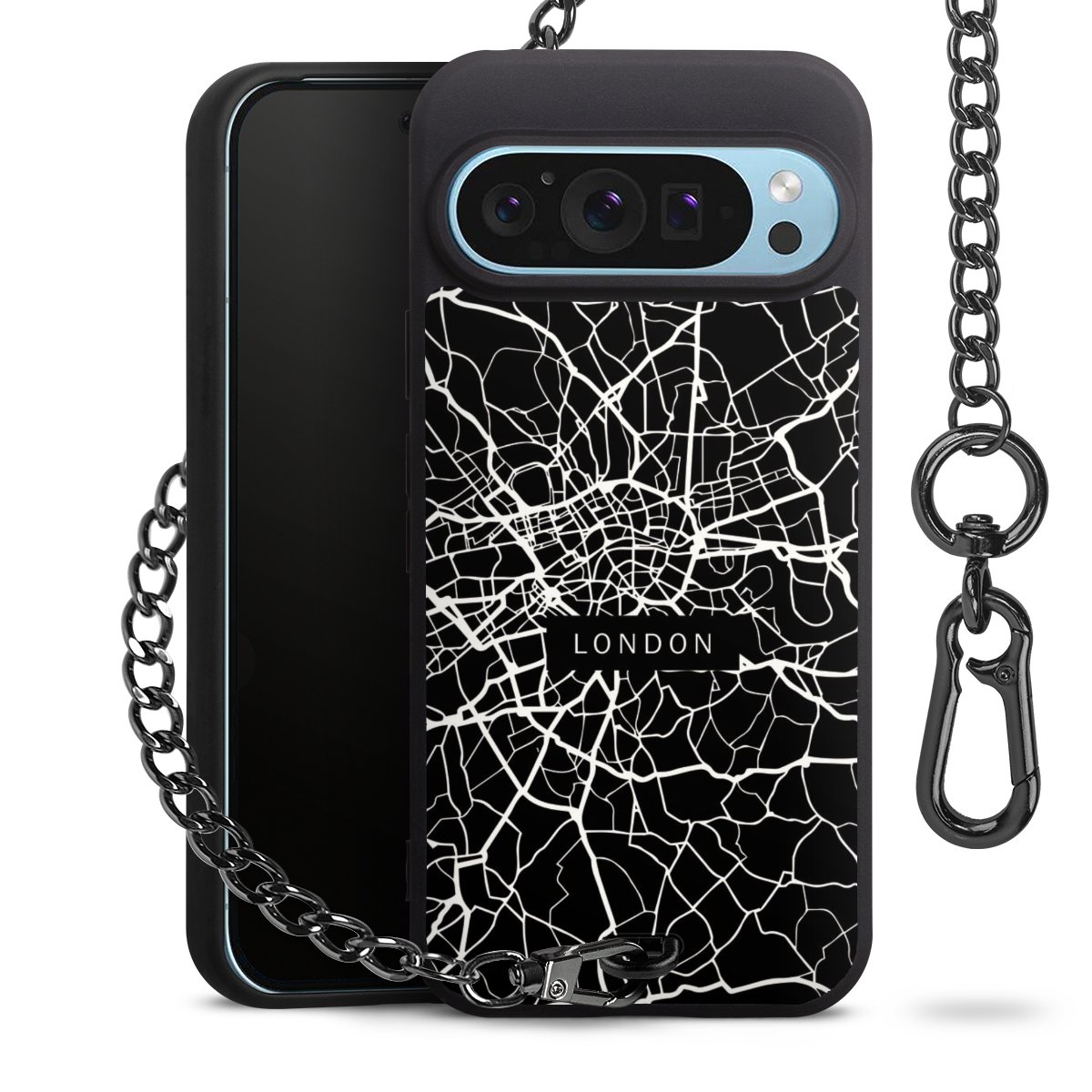 - Mattschwarze Handyhülle mit Metallkette