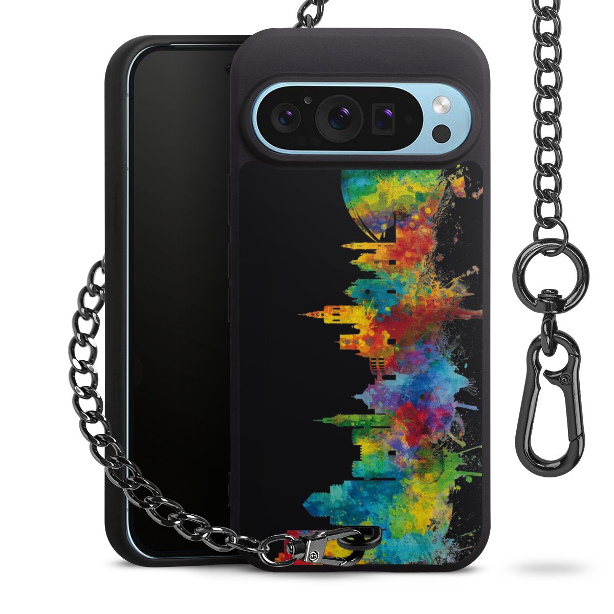 Die mattschwarze Silikon-Handyhülle besteht aus robustem TPU (thermoplastisches Polyurethan). Sie ist flexibel und schützt Dein Smartphone vor Stößen und Kratzern. Die Kette sowie der Karabinerhaken sind aus Metall in Gunmetal-Optik gefertigt. Für dieses Produkt kommen ausschließlich TÜV-geprüfte Materialien zum Einsatz.