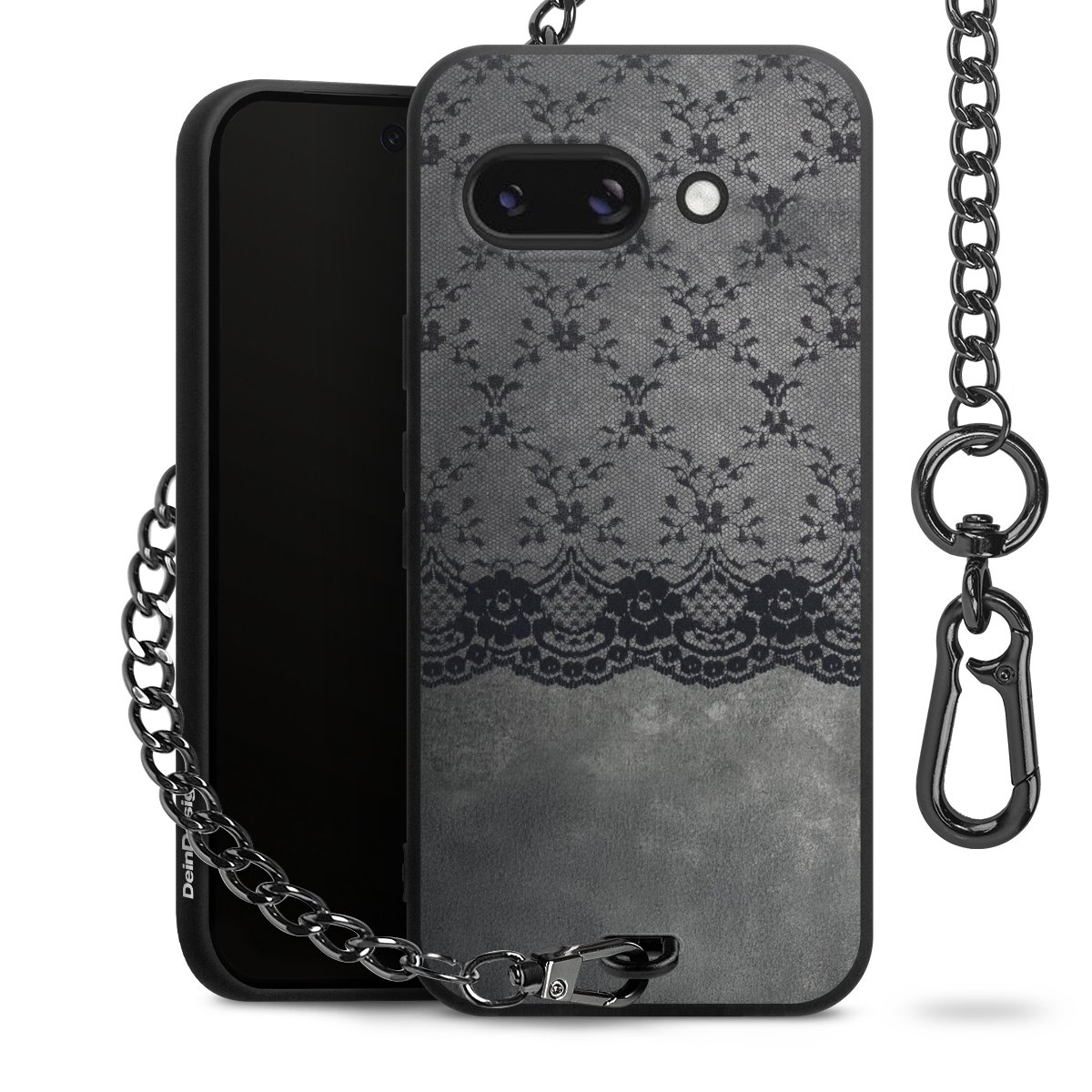 Die mattschwarze Silikon-Handyhülle besteht aus robustem TPU (thermoplastisches Polyurethan). Sie ist flexibel und schützt Dein Smartphone vor Stößen und Kratzern. Die Kette sowie der Karabinerhaken sind aus Metall in Gunmetal-Optik gefertigt. Für dieses Produkt kommen ausschließlich TÜV-geprüfte Materialien zum Einsatz.
