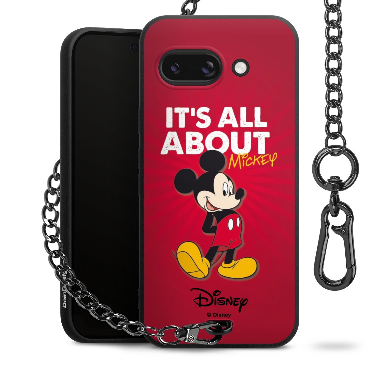 Die Handyhülle verfügt über eine mittig am unteren Rand platzierte Öse, an der die Metallkette stabil befestigt ist. Bestelle die Hülle einfach für Dein Smartphone-Modell, dann passt sie wie angegossen und Du brauchst sie bloß einmal anzudrücken. Handy in die Tasche, Karabiner an den Hosenbund – schon kann die Party starten.
