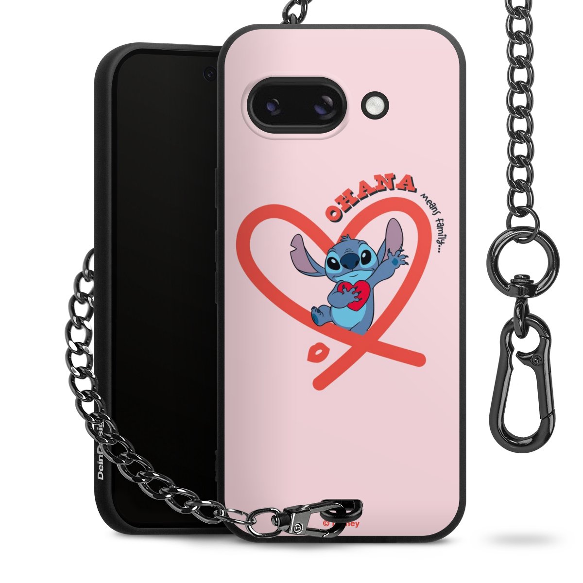 Die Handyhülle verfügt über eine mittig am unteren Rand platzierte Öse, an der die Metallkette stabil befestigt ist. Bestelle die Hülle einfach für Dein Smartphone-Modell, dann passt sie wie angegossen und Du brauchst sie bloß einmal anzudrücken. Handy in die Tasche, Karabiner an den Hosenbund – schon kann die Party starten.
