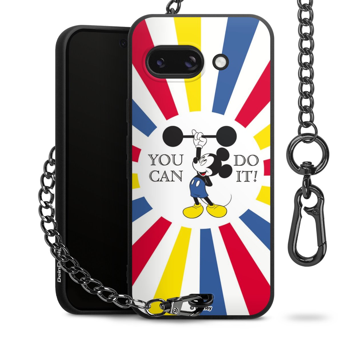 Die Handyhülle verfügt über eine mittig am unteren Rand platzierte Öse, an der die Metallkette stabil befestigt ist. Bestelle die Hülle einfach für Dein Smartphone-Modell, dann passt sie wie angegossen und Du brauchst sie bloß einmal anzudrücken. Handy in die Tasche, Karabiner an den Hosenbund – schon kann die Party starten.