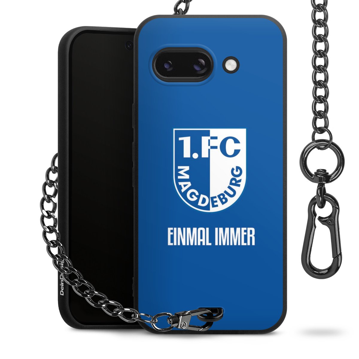 Die Handyhülle verfügt über eine mittig am unteren Rand platzierte Öse, an der die Metallkette stabil befestigt ist. Bestelle die Hülle einfach für Dein Smartphone-Modell, dann passt sie wie angegossen und Du brauchst sie bloß einmal anzudrücken. Handy in die Tasche, Karabiner an den Hosenbund – schon kann die Party starten.
