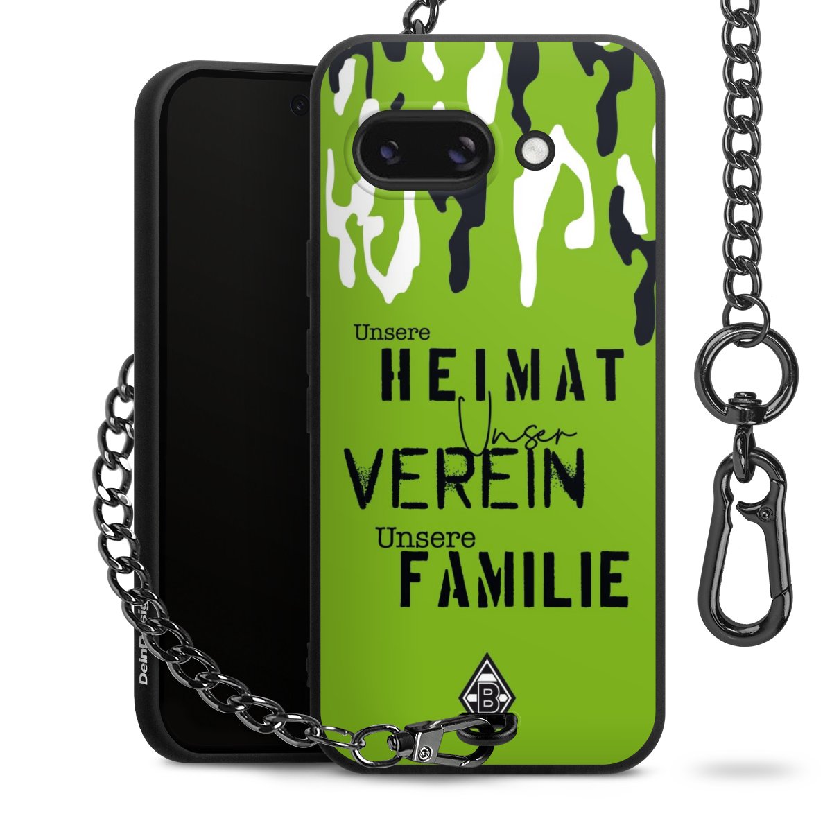 Die mattschwarze Silikon-Handyhülle besteht aus robustem TPU (thermoplastisches Polyurethan). Sie ist flexibel und schützt Dein Smartphone vor Stößen und Kratzern. Die Kette sowie der Karabinerhaken sind aus Metall in Gunmetal-Optik gefertigt. Für dieses Produkt kommen ausschließlich TÜV-geprüfte Materialien zum Einsatz.