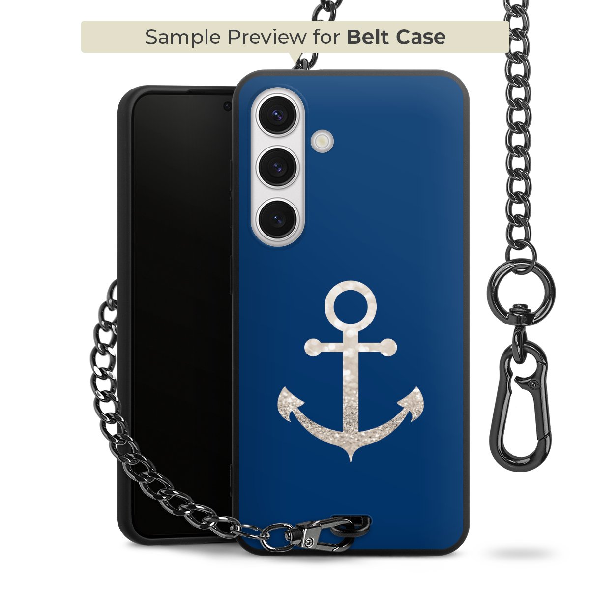 Die Handyhülle verfügt über eine mittig am unteren Rand platzierte Öse, an der die Metallkette stabil befestigt ist. Bestelle die Hülle einfach für Dein Smartphone-Modell, dann passt sie wie angegossen und Du brauchst sie bloß einmal anzudrücken. Handy in die Tasche, Karabiner an den Hosenbund – schon kann die Party starten.