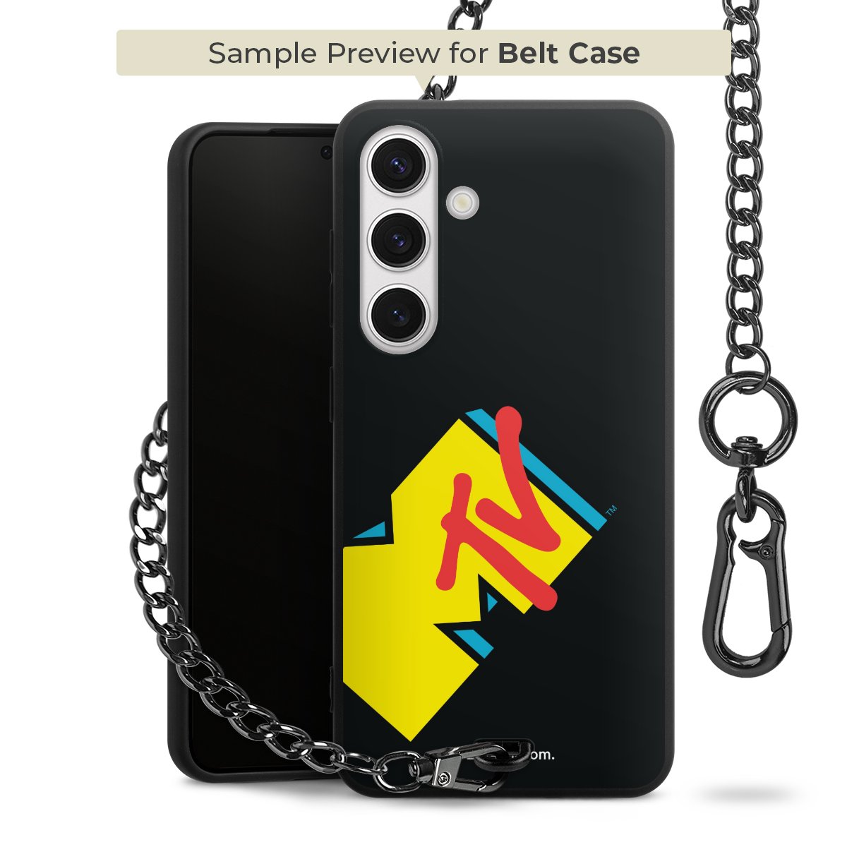 Die Handyhülle verfügt über eine mittig am unteren Rand platzierte Öse, an der die Metallkette stabil befestigt ist. Bestelle die Hülle einfach für Dein Smartphone-Modell, dann passt sie wie angegossen und Du brauchst sie bloß einmal anzudrücken. Handy in die Tasche, Karabiner an den Hosenbund – schon kann die Party starten.