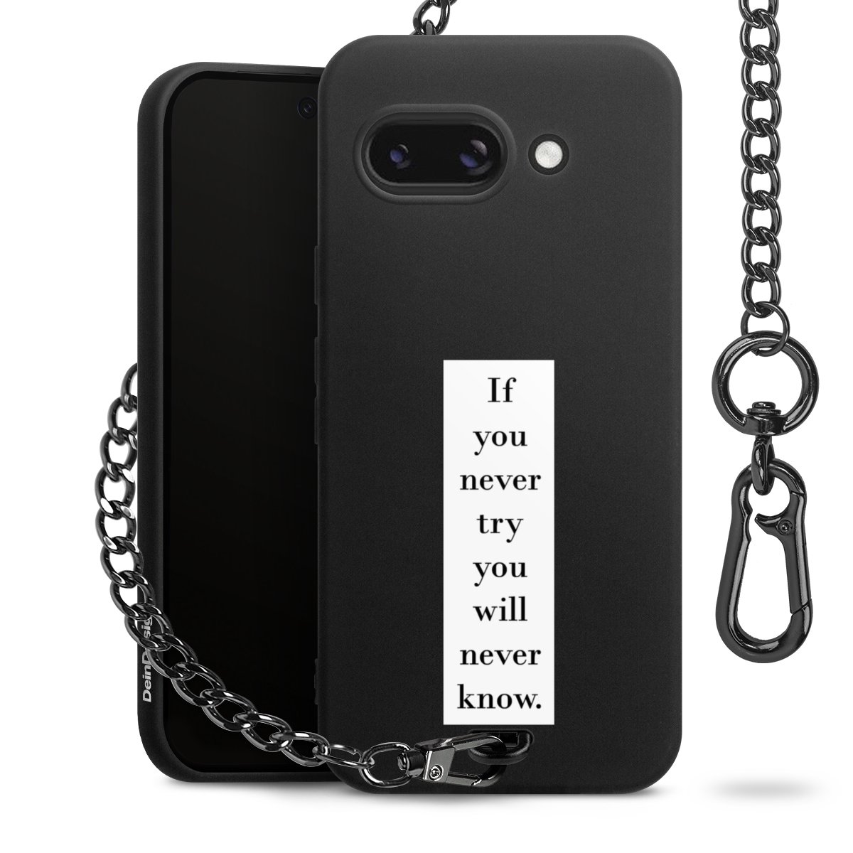 Die mattschwarze Silikon-Handyhülle besteht aus robustem TPU (thermoplastisches Polyurethan). Sie ist flexibel und schützt Dein Smartphone vor Stößen und Kratzern. Die Kette sowie der Karabinerhaken sind aus Metall in Gunmetal-Optik gefertigt. Für dieses Produkt kommen ausschließlich TÜV-geprüfte Materialien zum Einsatz.