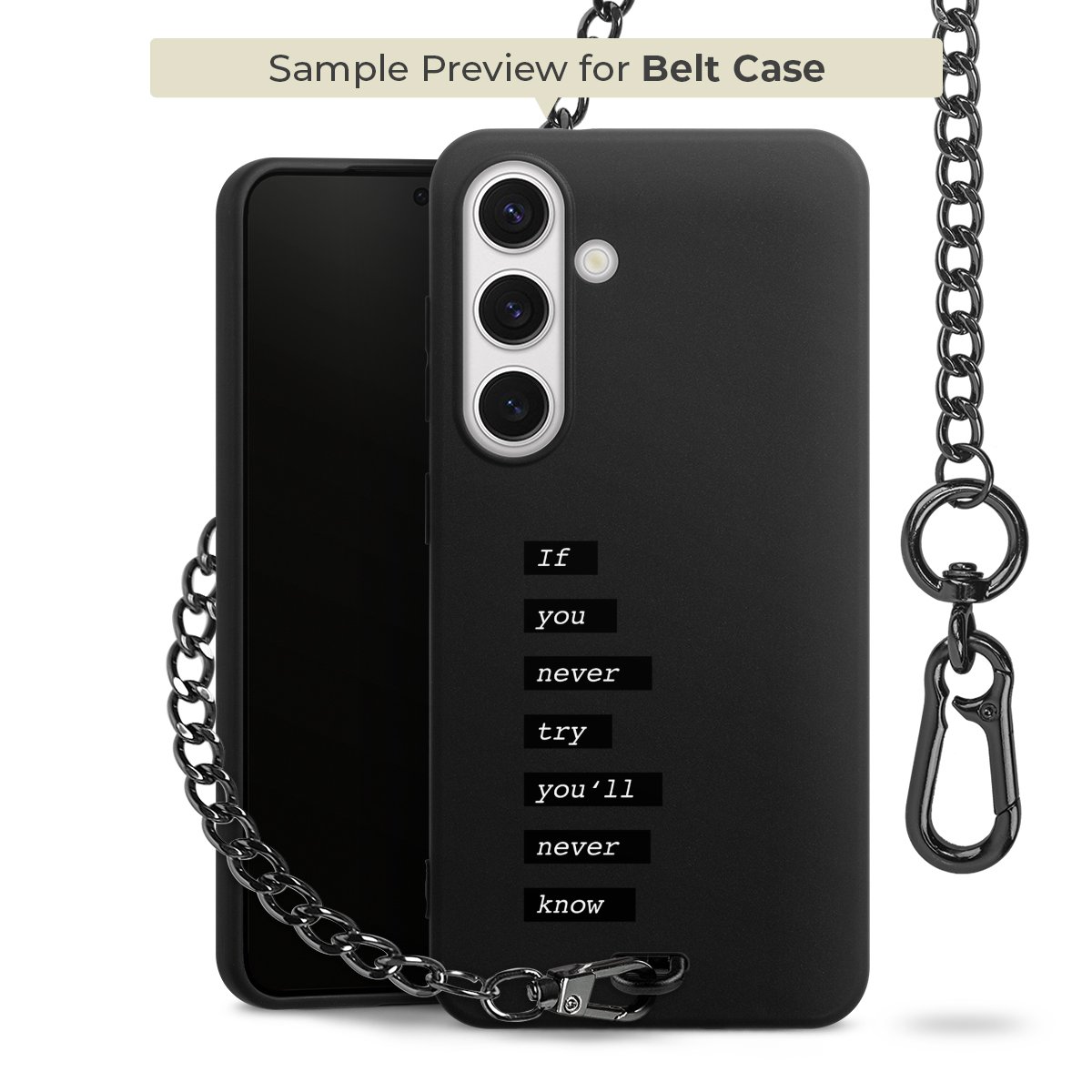Ob im Alltag, beim Feiern mit Deinen Jungs oder auf Festivals – mit dem superpraktischen Belt Case steckst Du alle Sorgen um Diebstahl und Spider-App ganz entspannt in die Tasche. Es besteht aus einem coolen mattschwarzen Silikon Premium Case, dem Du ein individuelles Design verpassen kannst, und einer daran befestigten Kette in lässiger Gunmetal-Optik. Mit dem Karabiner auf der anderen Seite klickst Du die Kette mit einem Handgriff an Deine Gürtelschlaufe und schon ist Dein Smartphone sicher und stets griffbereit in der Hosentasche verstaut.