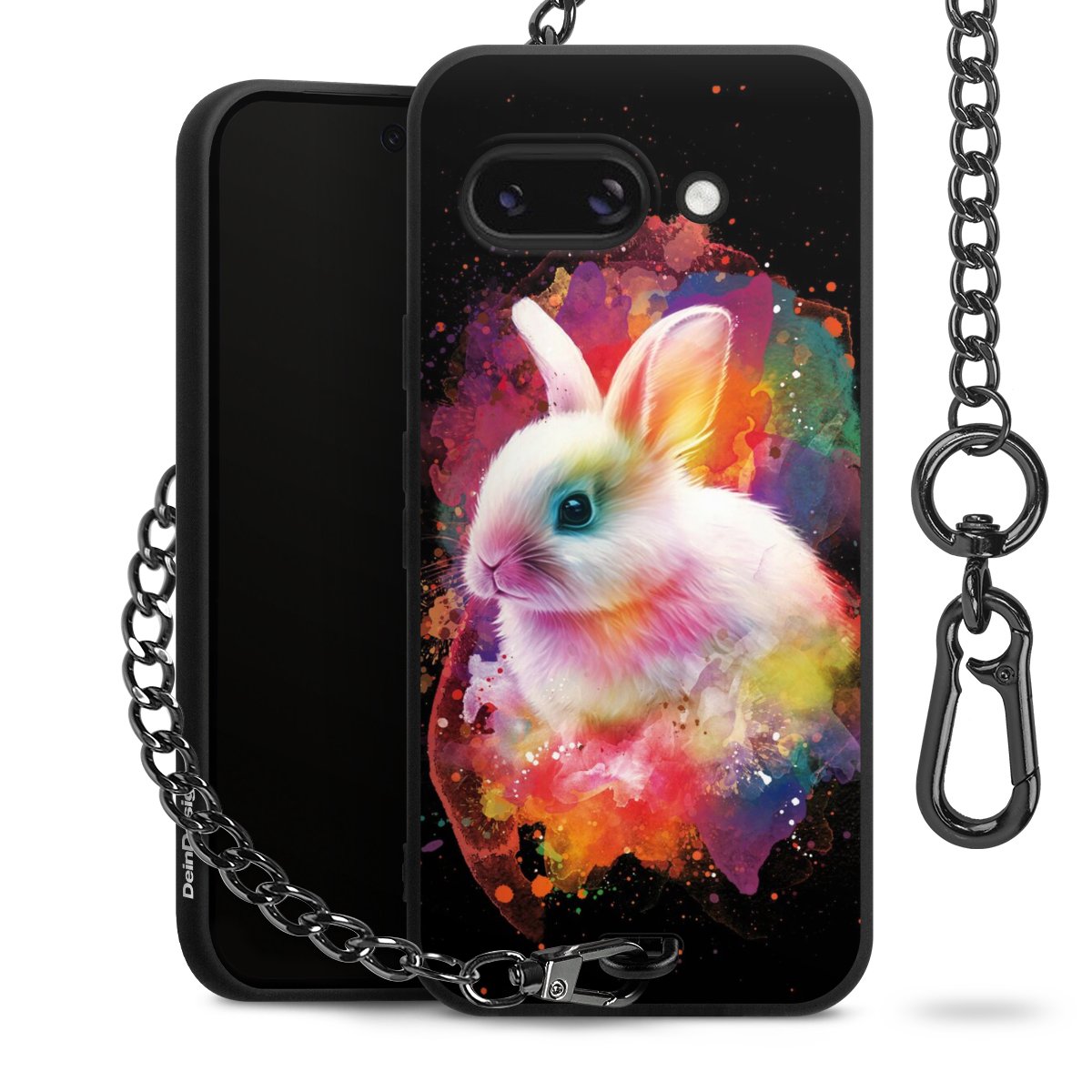 Die Handyhülle verfügt über eine mittig am unteren Rand platzierte Öse, an der die Metallkette stabil befestigt ist. Bestelle die Hülle einfach für Dein Smartphone-Modell, dann passt sie wie angegossen und Du brauchst sie bloß einmal anzudrücken. Handy in die Tasche, Karabiner an den Hosenbund – schon kann die Party starten.