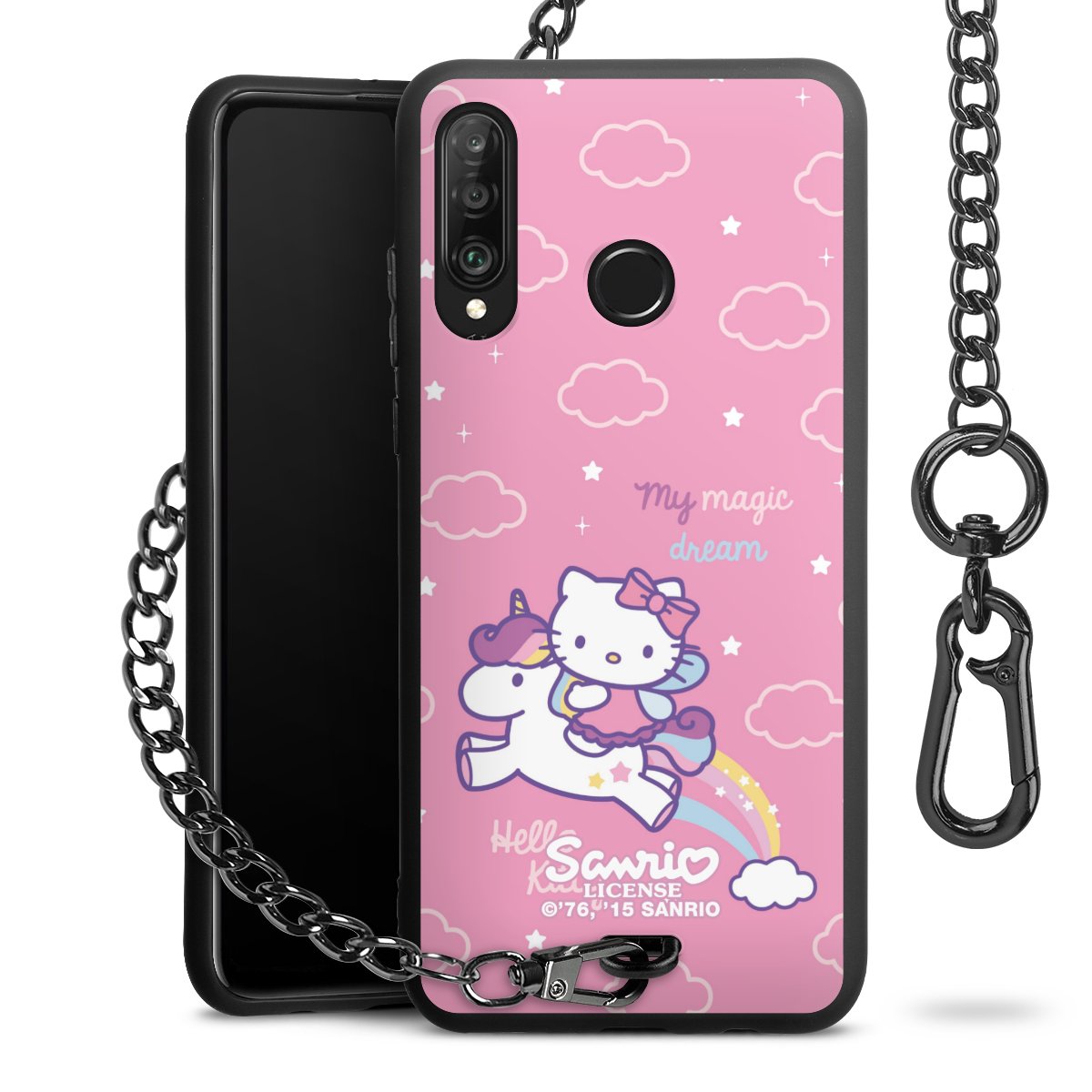 Die Handyhülle verfügt über eine mittig am unteren Rand platzierte Öse, an der die Metallkette stabil befestigt ist. Bestelle die Hülle einfach für Dein Smartphone-Modell, dann passt sie wie angegossen und Du brauchst sie bloß einmal anzudrücken. Handy in die Tasche, Karabiner an den Hosenbund – schon kann die Party starten.