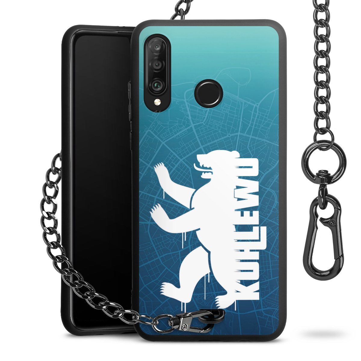 Die Handyhülle verfügt über eine mittig am unteren Rand platzierte Öse, an der die Metallkette stabil befestigt ist. Bestelle die Hülle einfach für Dein Smartphone-Modell, dann passt sie wie angegossen und Du brauchst sie bloß einmal anzudrücken. Handy in die Tasche, Karabiner an den Hosenbund – schon kann die Party starten.