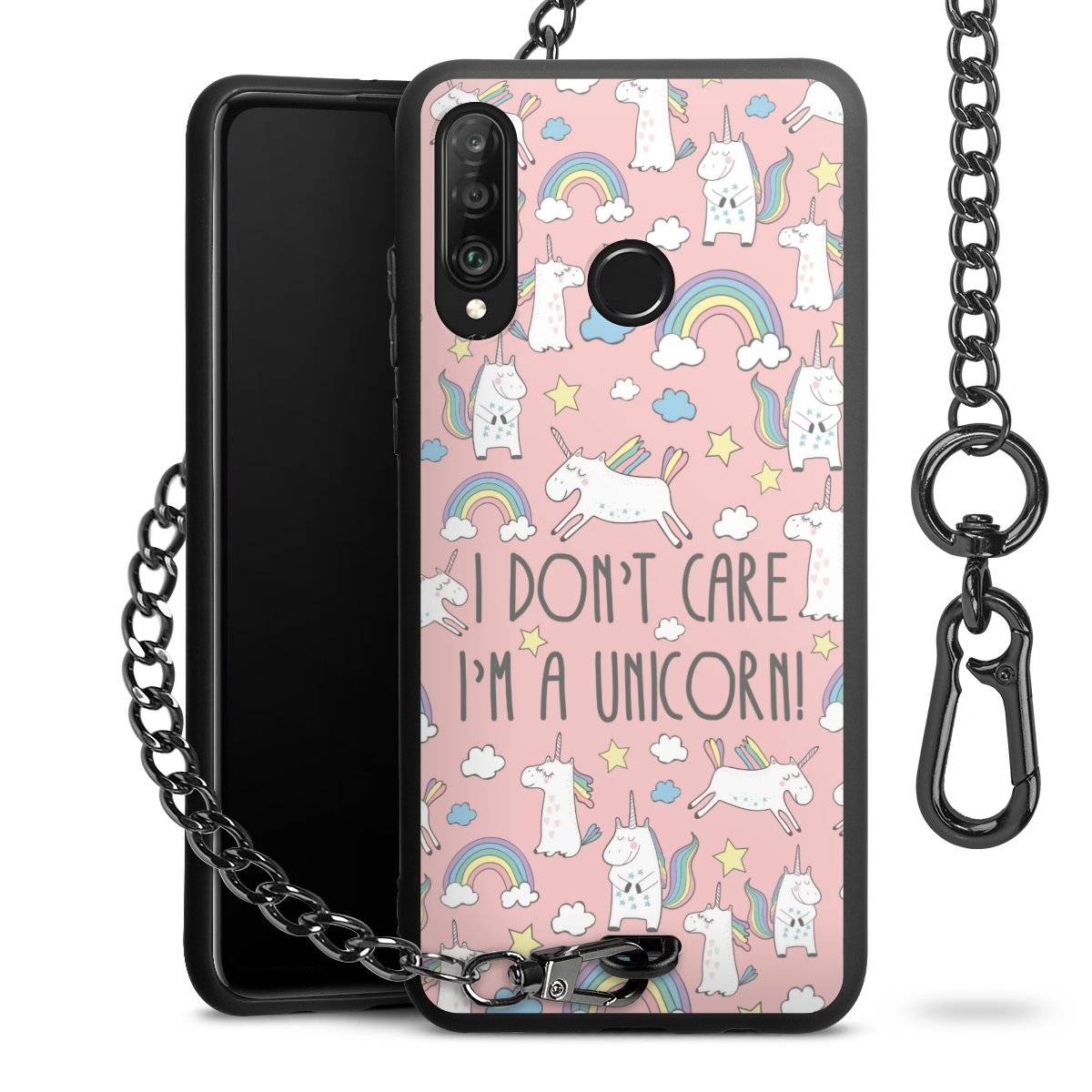 Die Handyhülle verfügt über eine mittig am unteren Rand platzierte Öse, an der die Metallkette stabil befestigt ist. Bestelle die Hülle einfach für Dein Smartphone-Modell, dann passt sie wie angegossen und Du brauchst sie bloß einmal anzudrücken. Handy in die Tasche, Karabiner an den Hosenbund – schon kann die Party starten.