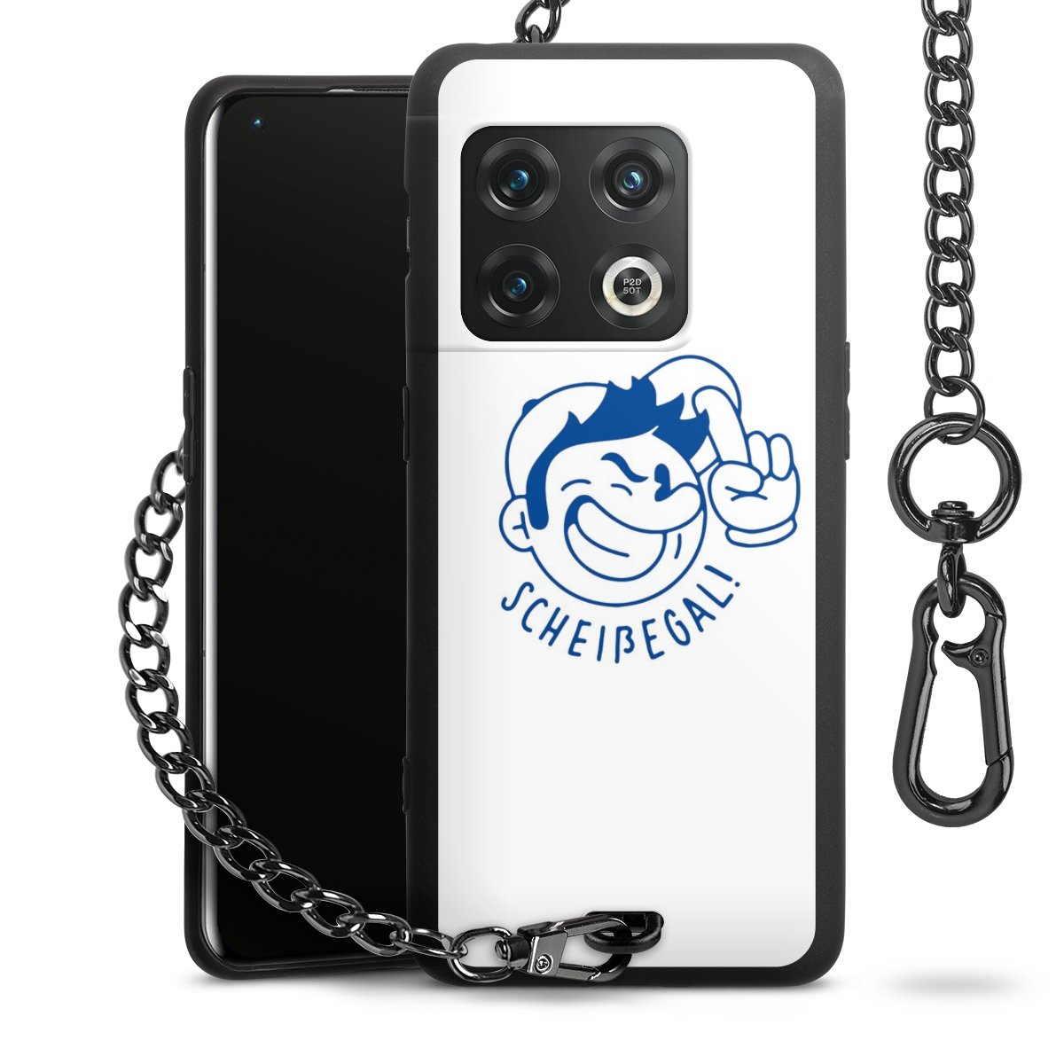 Die Handyhülle verfügt über eine mittig am unteren Rand platzierte Öse, an der die Metallkette stabil befestigt ist. Bestelle die Hülle einfach für Dein Smartphone-Modell, dann passt sie wie angegossen und Du brauchst sie bloß einmal anzudrücken. Handy in die Tasche, Karabiner an den Hosenbund – schon kann die Party starten.