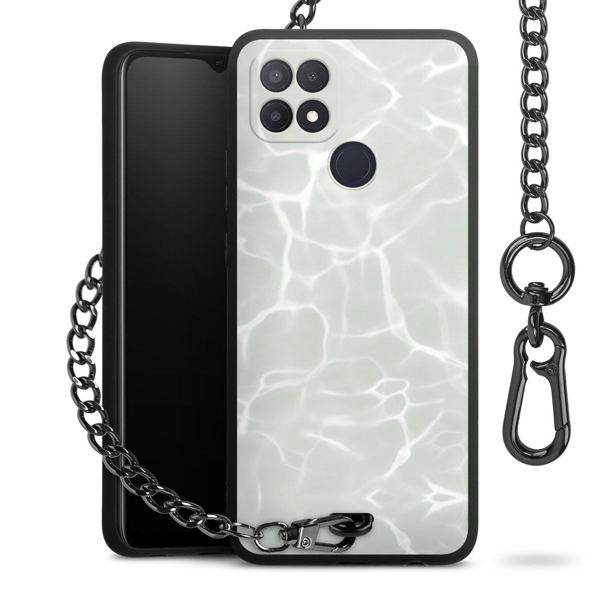 Die mattschwarze Silikon-Handyhülle besteht aus robustem TPU (thermoplastisches Polyurethan). Sie ist flexibel und schützt Dein Smartphone vor Stößen und Kratzern. Die Kette sowie der Karabinerhaken sind aus Metall in Gunmetal-Optik gefertigt. Für dieses Produkt kommen ausschließlich TÜV-geprüfte Materialien zum Einsatz.